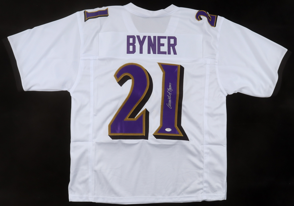 Custom jersey with everything sewn on, size XL. Hand-signed by Earnest Byner.