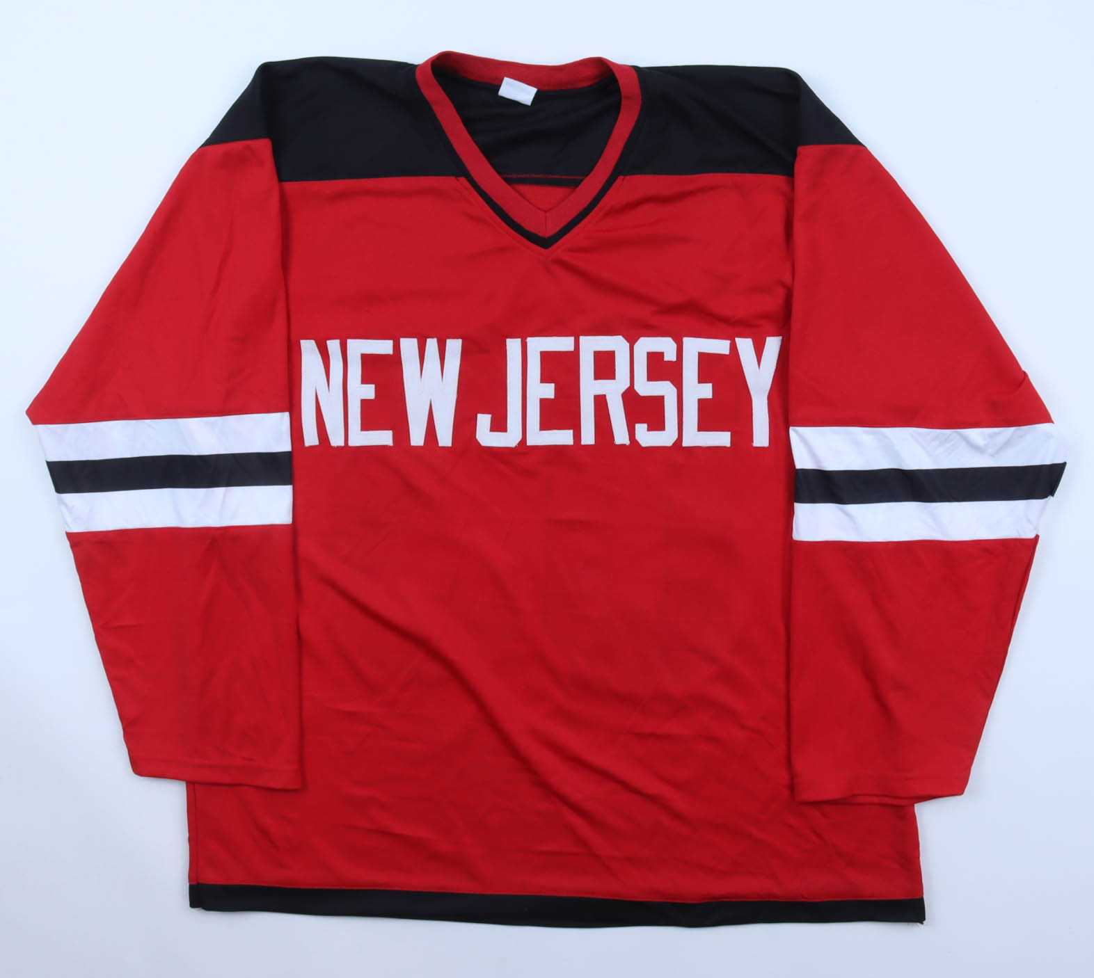 Custom jersey. Everything is sewn on, size XL. Hand-signed by (17) with Martin Brodeur, Joe Nieuwendyk, Patrik Elias, Scott Stevens, Scott Niedermayer, Ken Daneyko, Sergei Brylin, Jiri Bicek, Scott Gomez, Brian Gionta, Grant, Marshall, Tommy Albelin, Jamie Langenbrunner, Mike Rupp, Brian Rafalski, Colin White, & Turner Stevenson. Please note, there is staining on the reverse number and some signatures have bled.