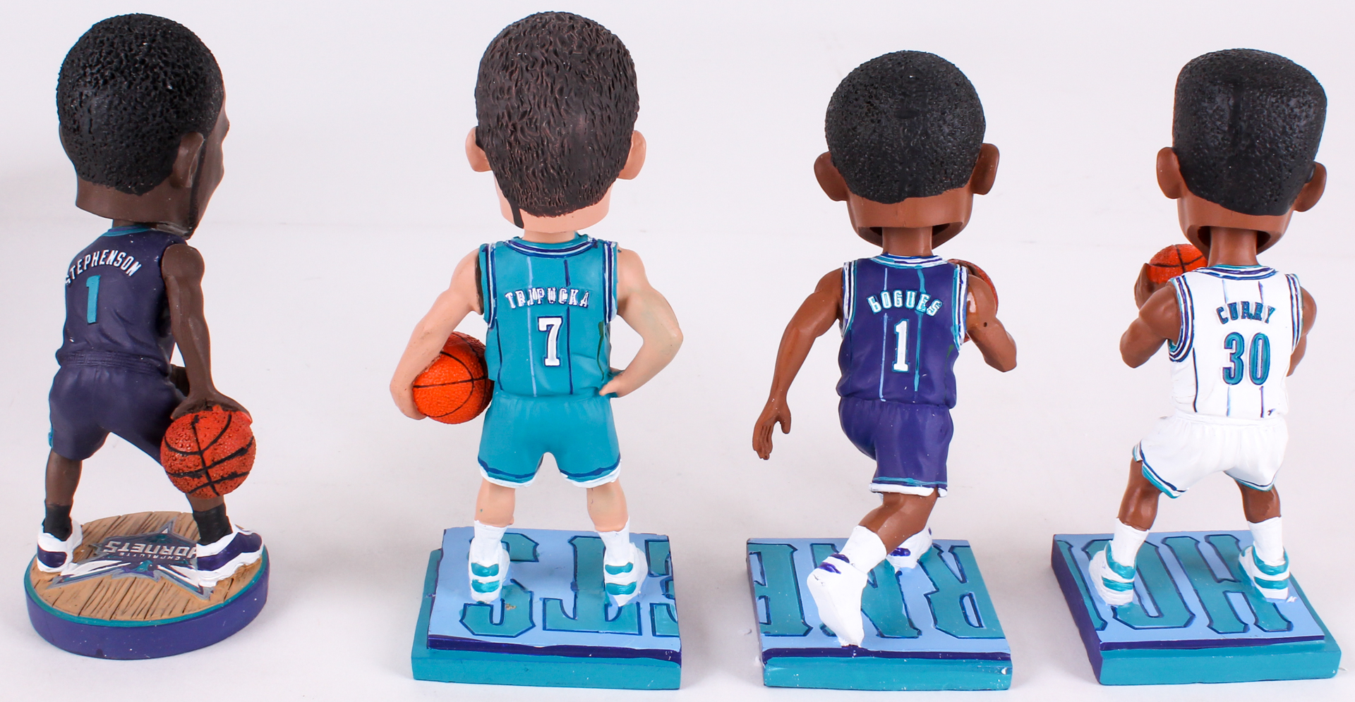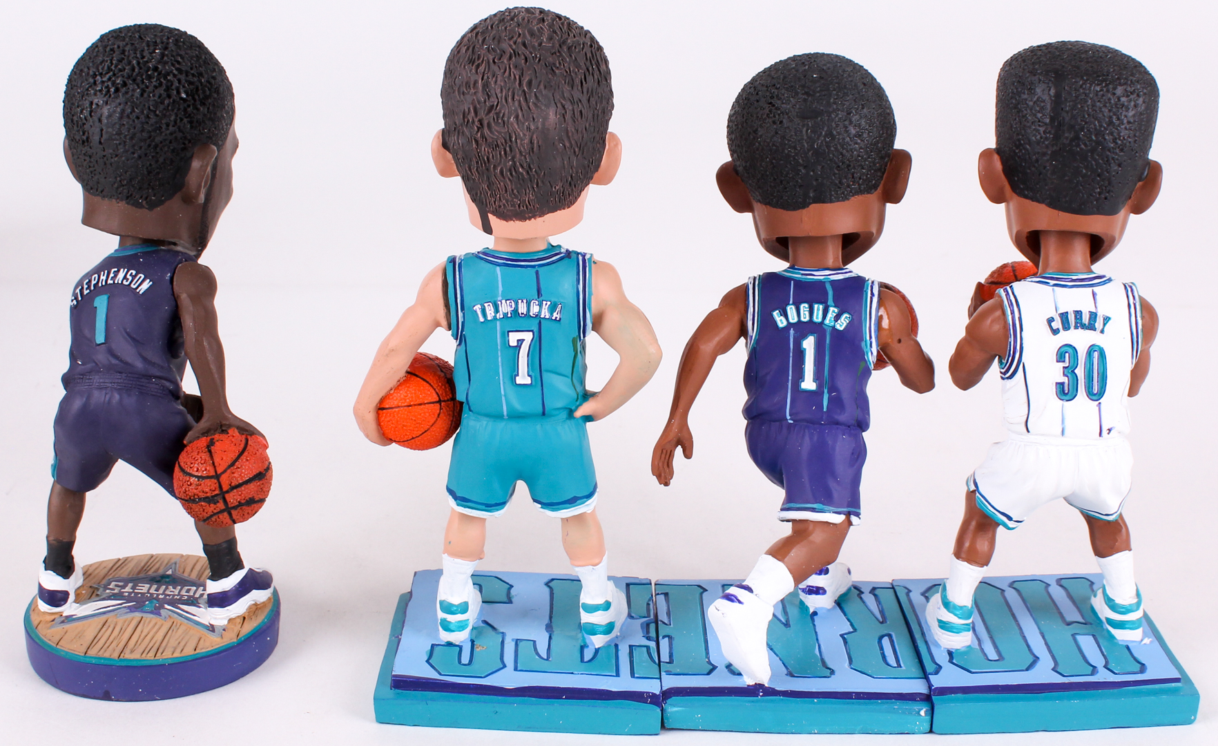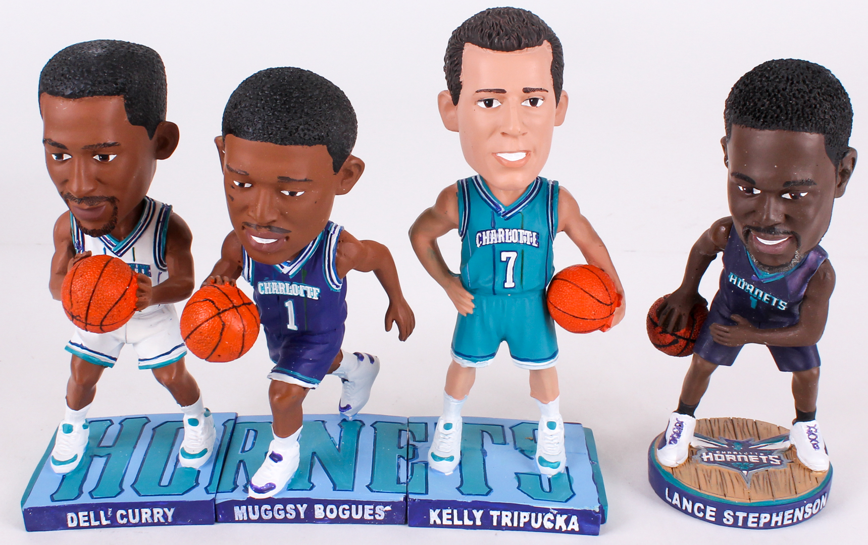 Lot of (4) Hornets Basketball Bobbleheads with Lance Stevenson Signed, Dell Curry, Muggsy Bogues & Kelly Tripucka (JSA COA)