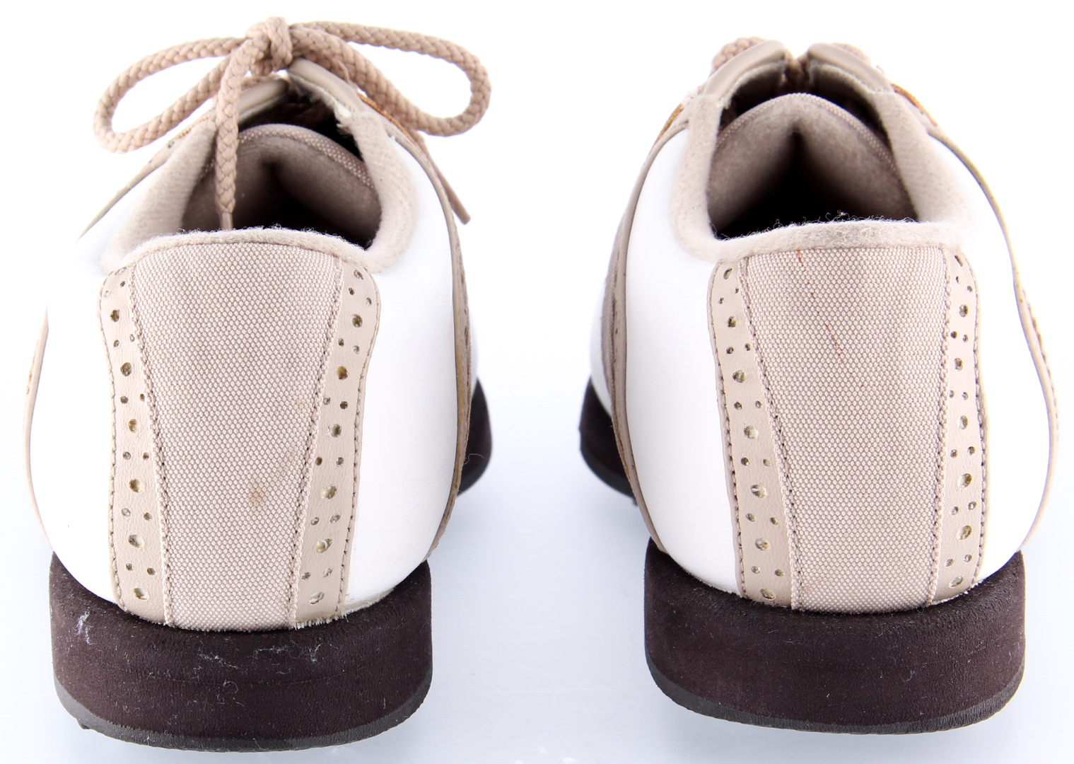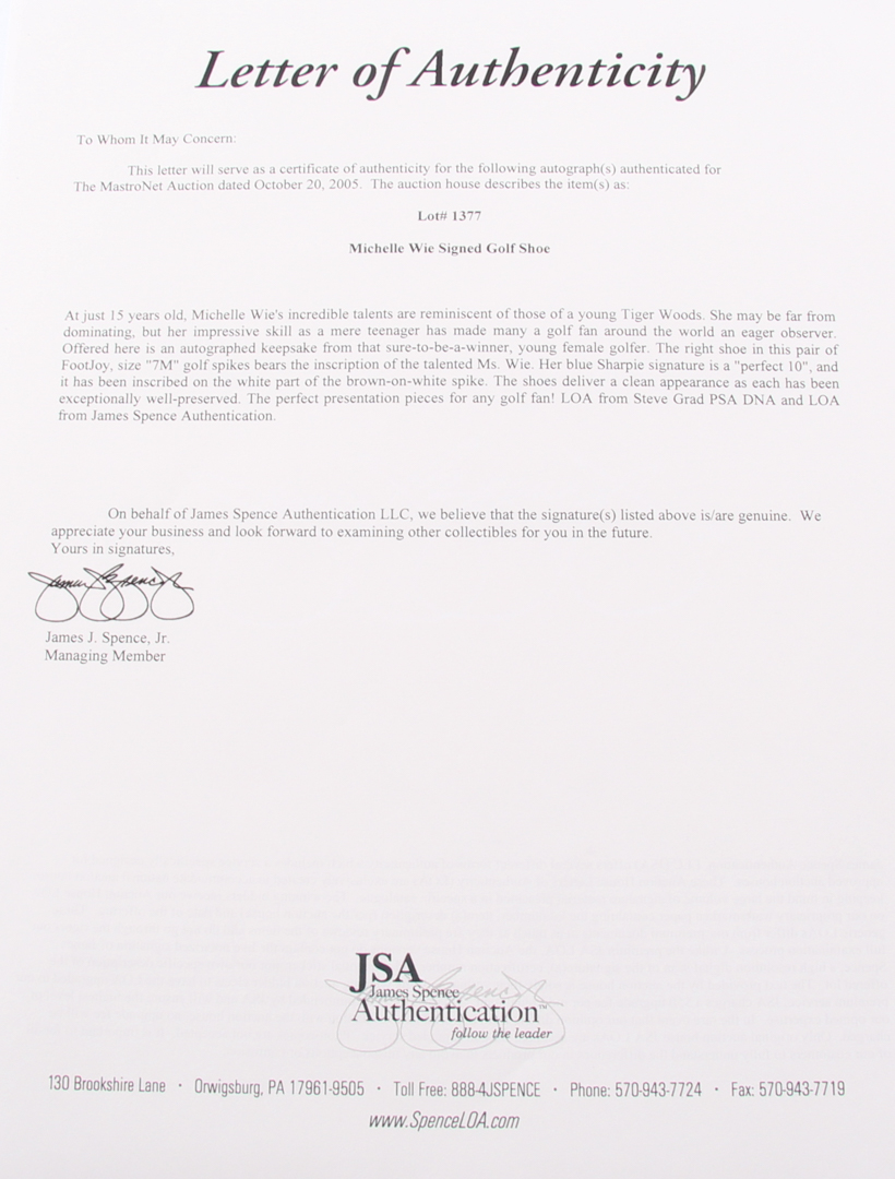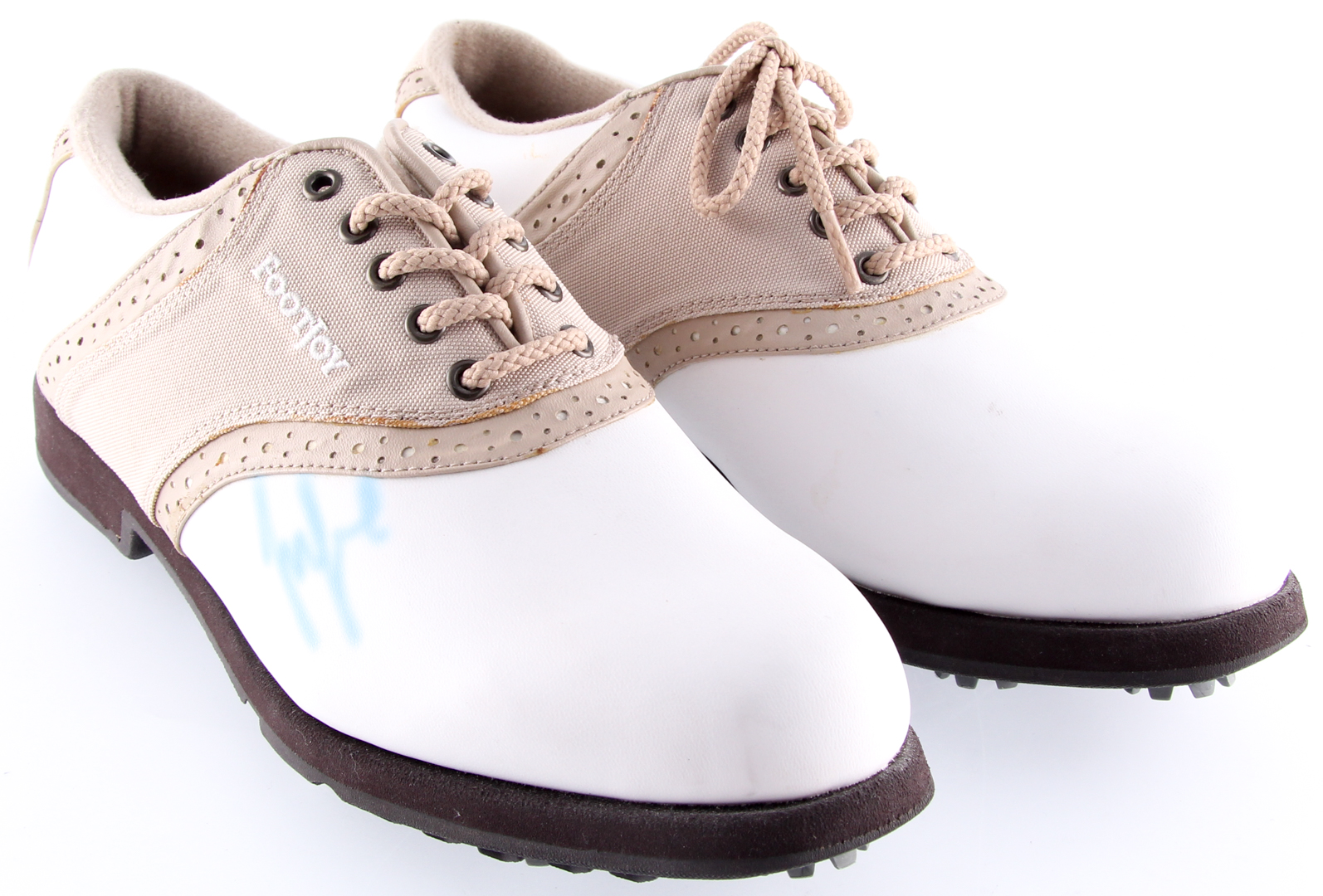 Pair of FootJoy golf shoes. (1) shoe has been hand-signed in blue felt-tip pen by Michelle Wie (LPGA). Please note, the signature has bled.