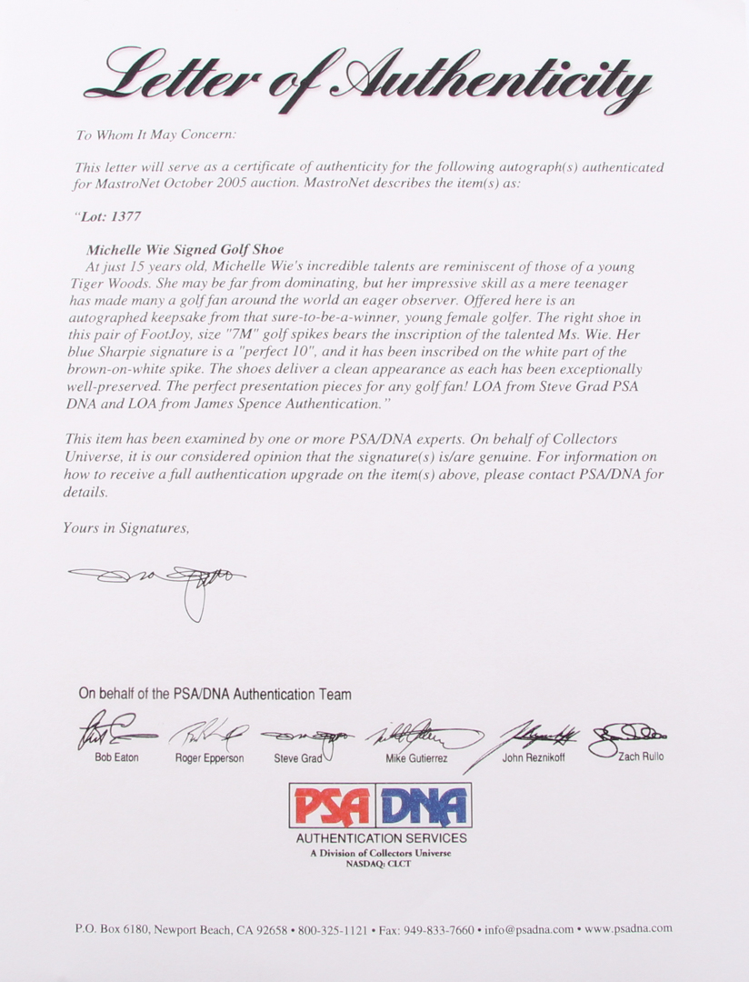 an official PSA/DNA Auction House LOA for authenticity purposes.