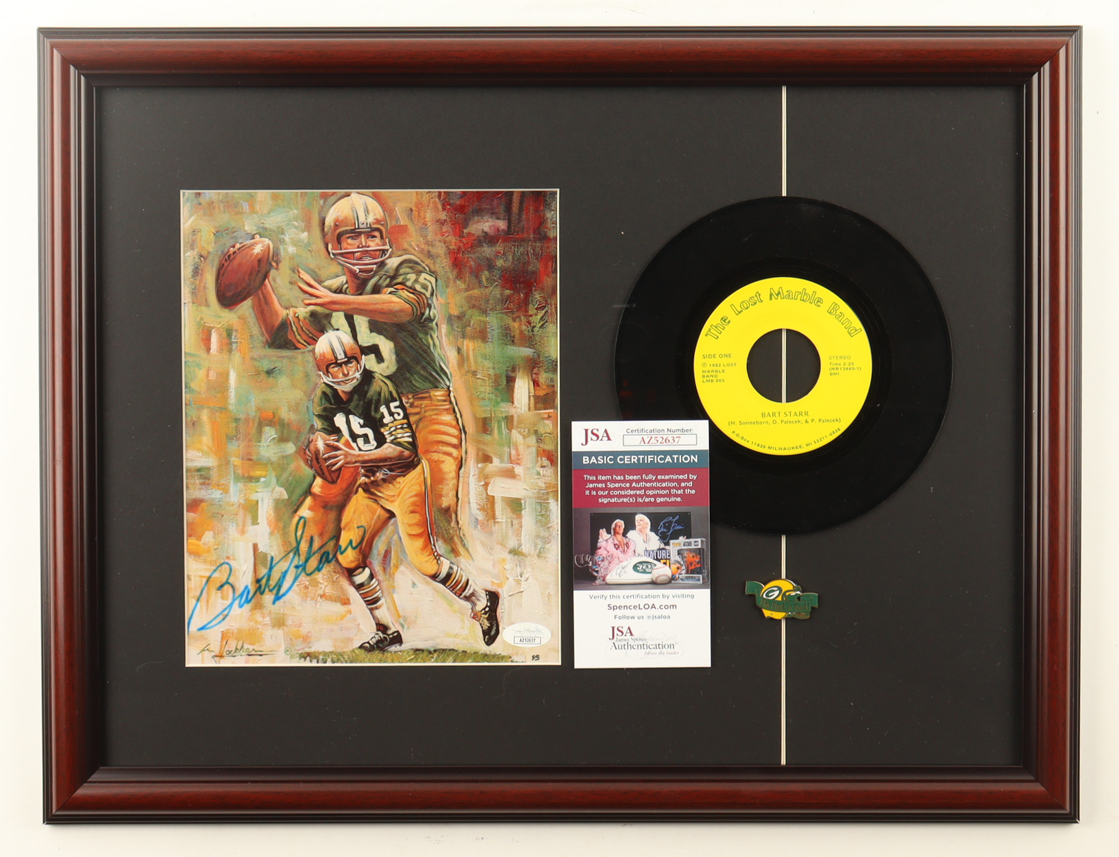 Bart Starr Signed Packers Custom Framed Art Print Display with Vintage Bart Starr Vinly Record & Green Bay Packers Logo Pin (JSA)