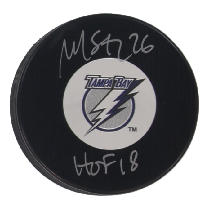 Martin St. Louis Signed Lightning Logo Hockey Puck Inscribed "HOF 18" (Schwartz)