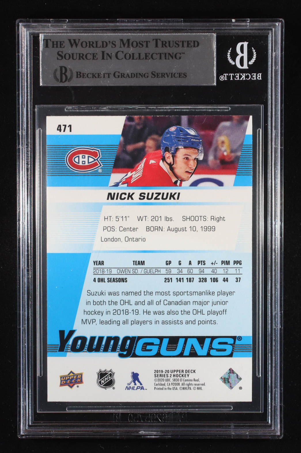 Nick Suzuki Signed 2019-20 Upper Deck #471 YG RC (Beckett | Auto Grade BGS Authentic)