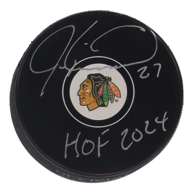 Jeremy Roenick Signed Blackhawks Logo Hockey Puck Inscribed "HOF 2024" (Schwartz)