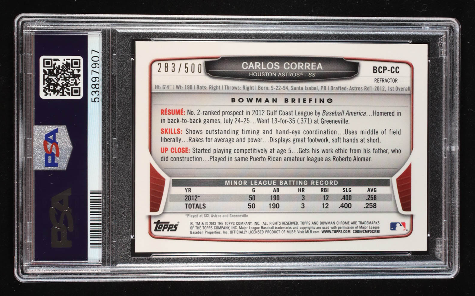 Carlos Correa 2013 Bowman Chrome Prospect Autographs Refractors #CC #283/500 RC (PSA 10 | Auto Grade PSA 10)