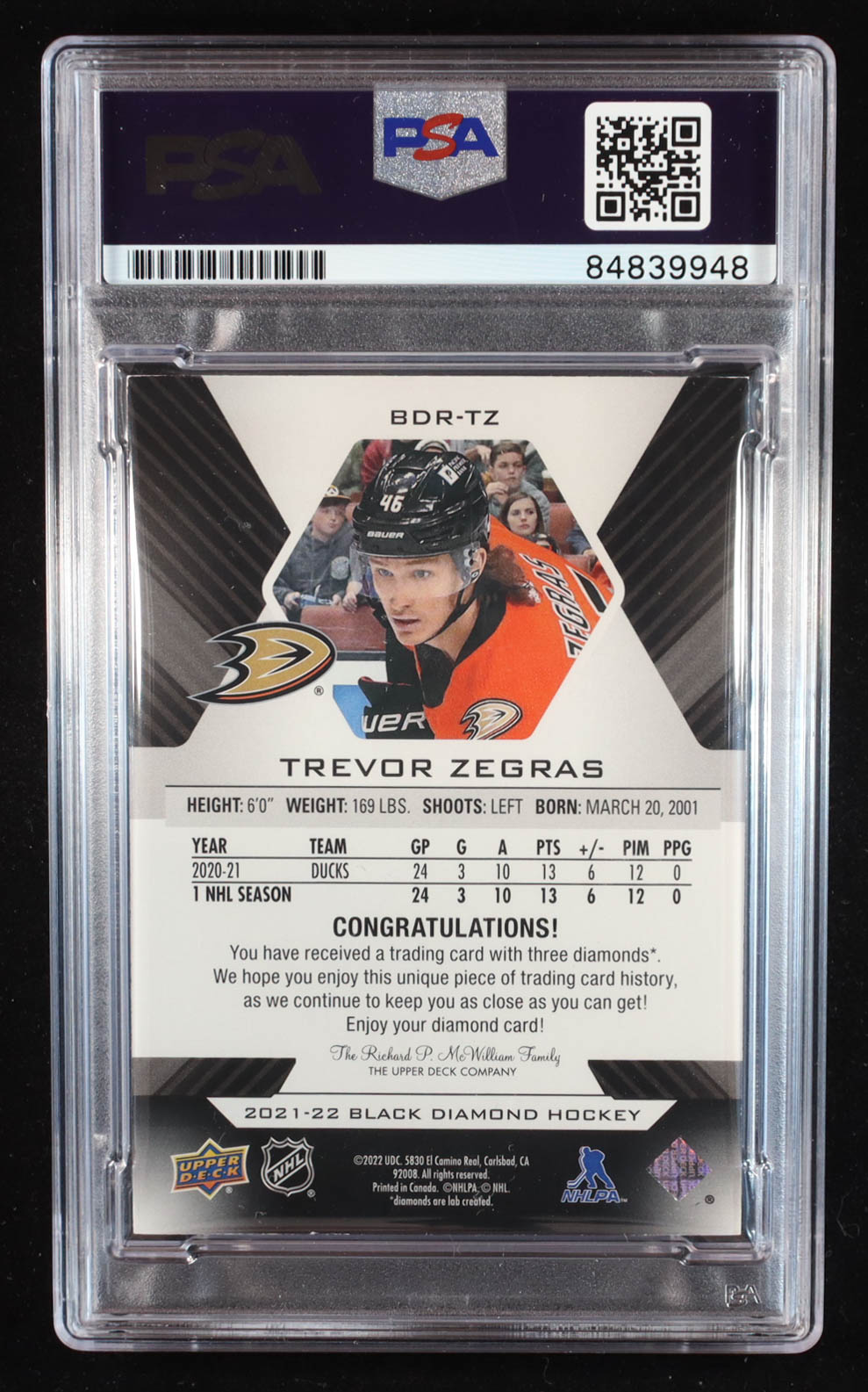 Trevor Zegras Signed 2021-22 Black Diamond #BDRTZ #44/99 RC (PSA | Auto Grade PSA Authentic)