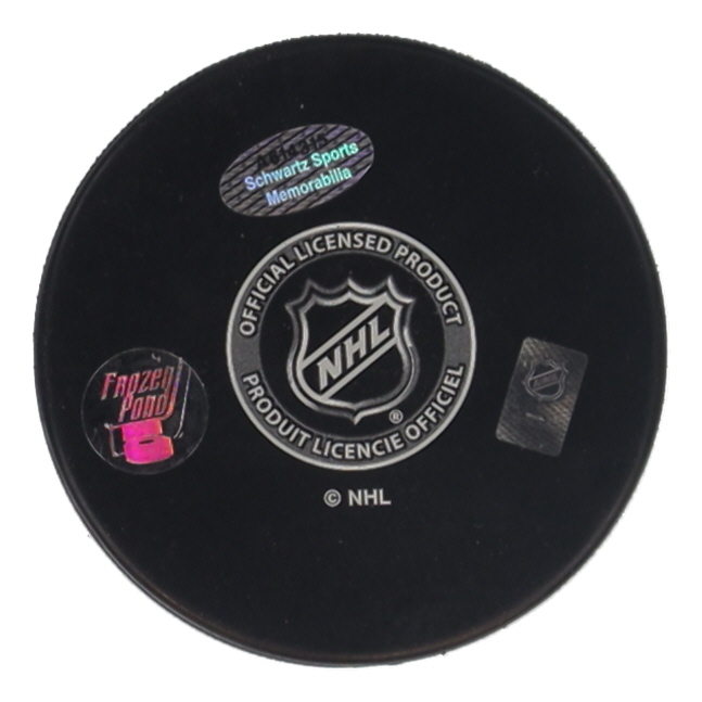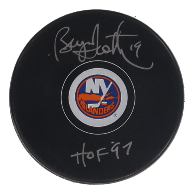 New York Islanders Logo Hockey Puck. Hand-signed and inscribed by Bryan Trottier (HOF).