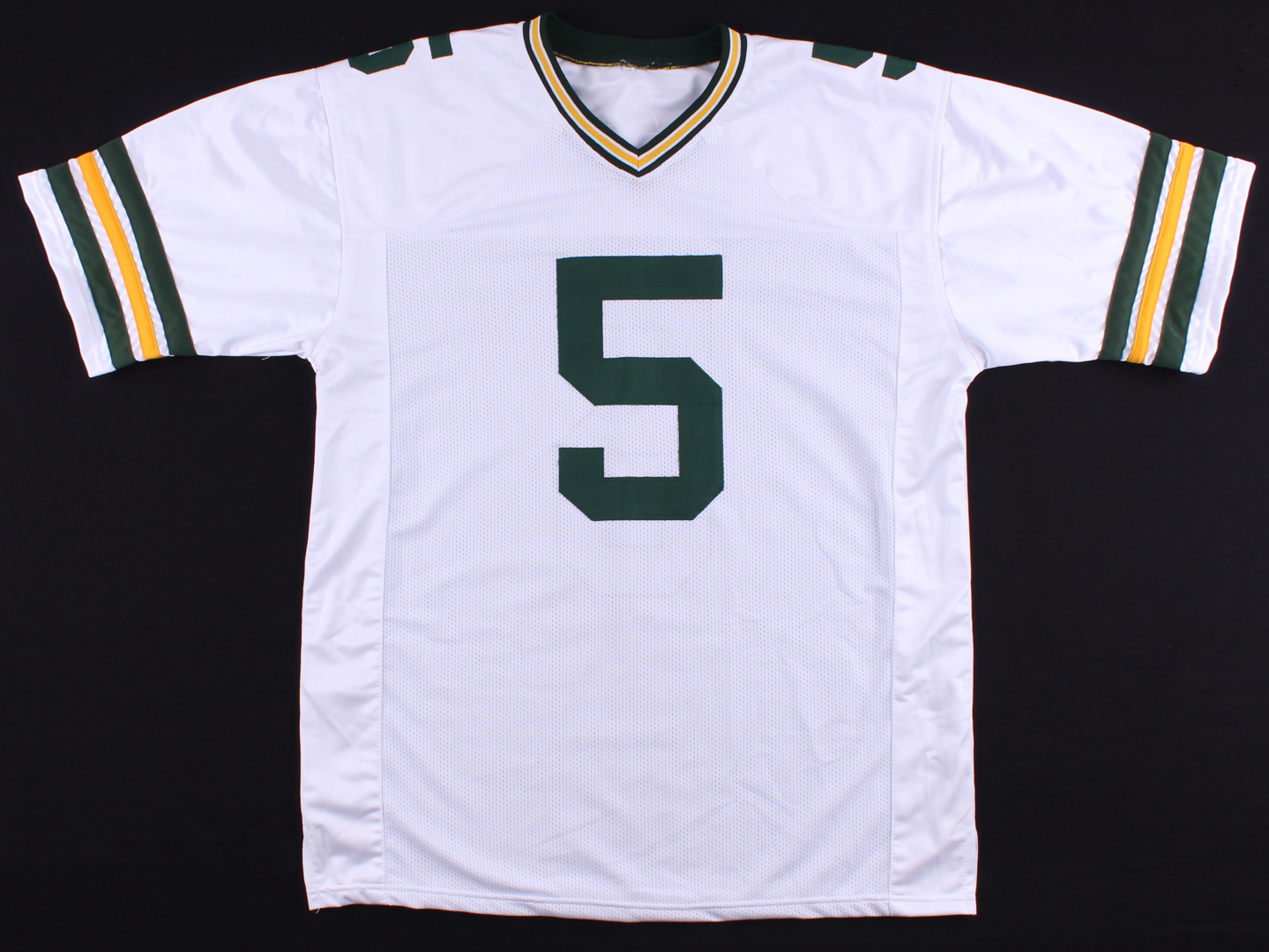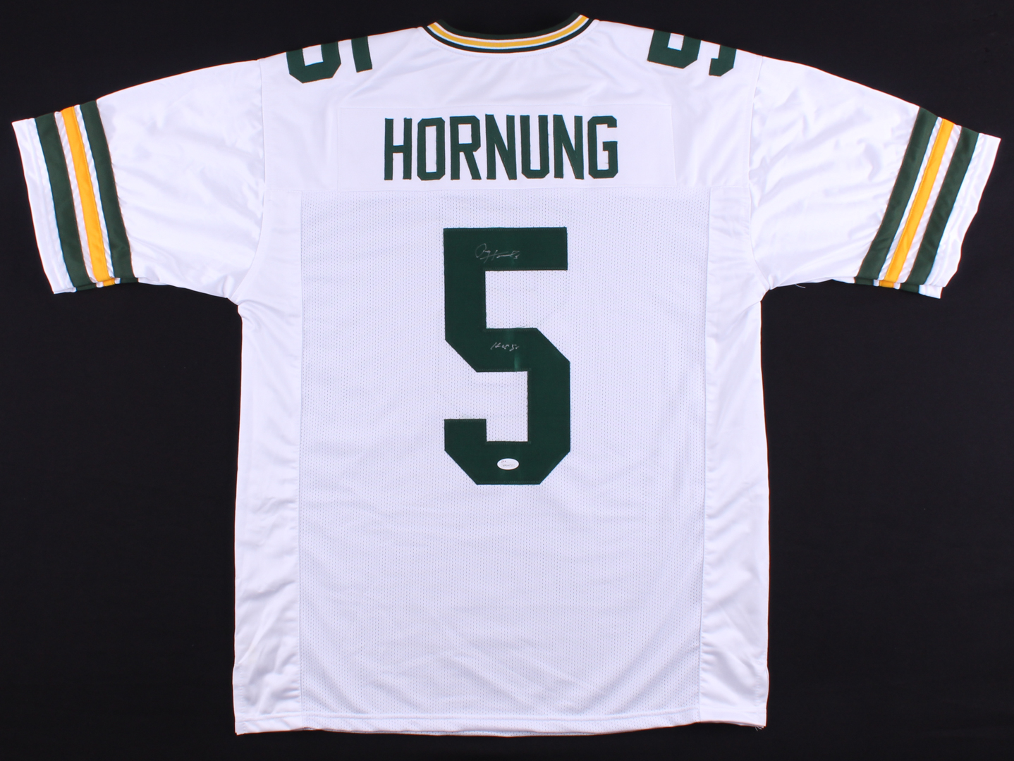 Custom on-field style jersey with everything sewn on, size XL. Jersey has been hand-signed in silver paint pen by Paul Hornung (Packers, HOF).
