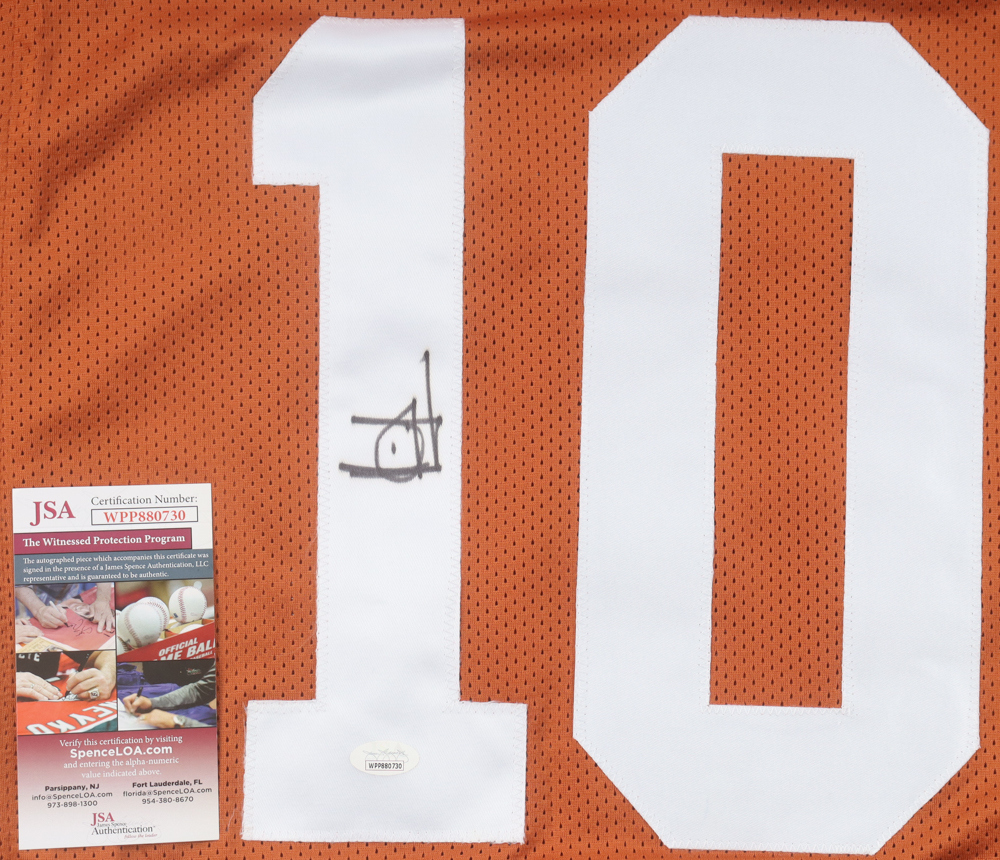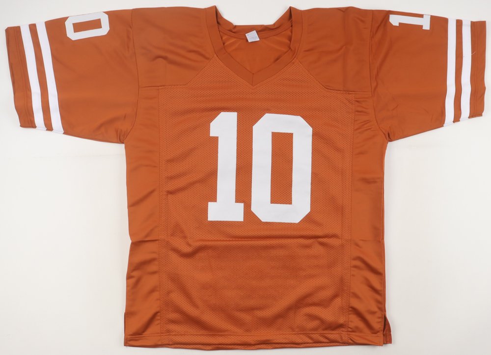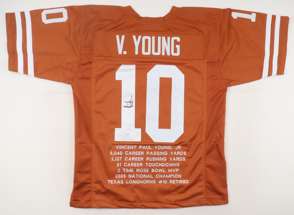 Custom jersey with everything sewn on, size XL. Hand-signed by Vince Young. Young's career highlights have been custom stitched onto the back of the jersey below the reverse numbers.