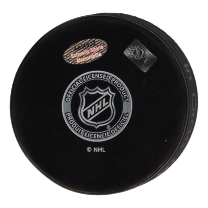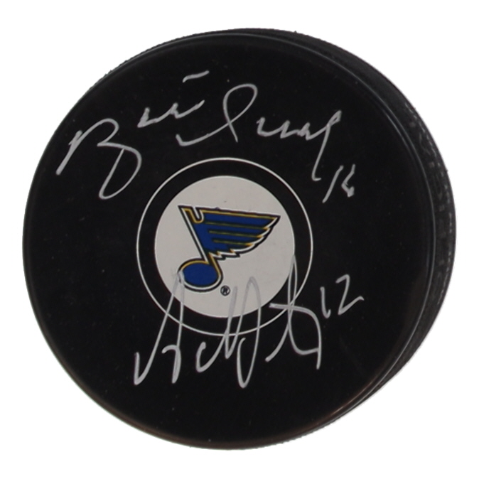 St. Louis Blues Logo Hockey Puck. Hand-signed by Brett Hull (HOF) and Adam Oates (HOF).