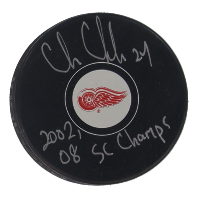 Chris Chelios Signed Red Wings Logo Hockey Puck Inscribed "HOF 2002, 08 SC Champs" (Schwartz)