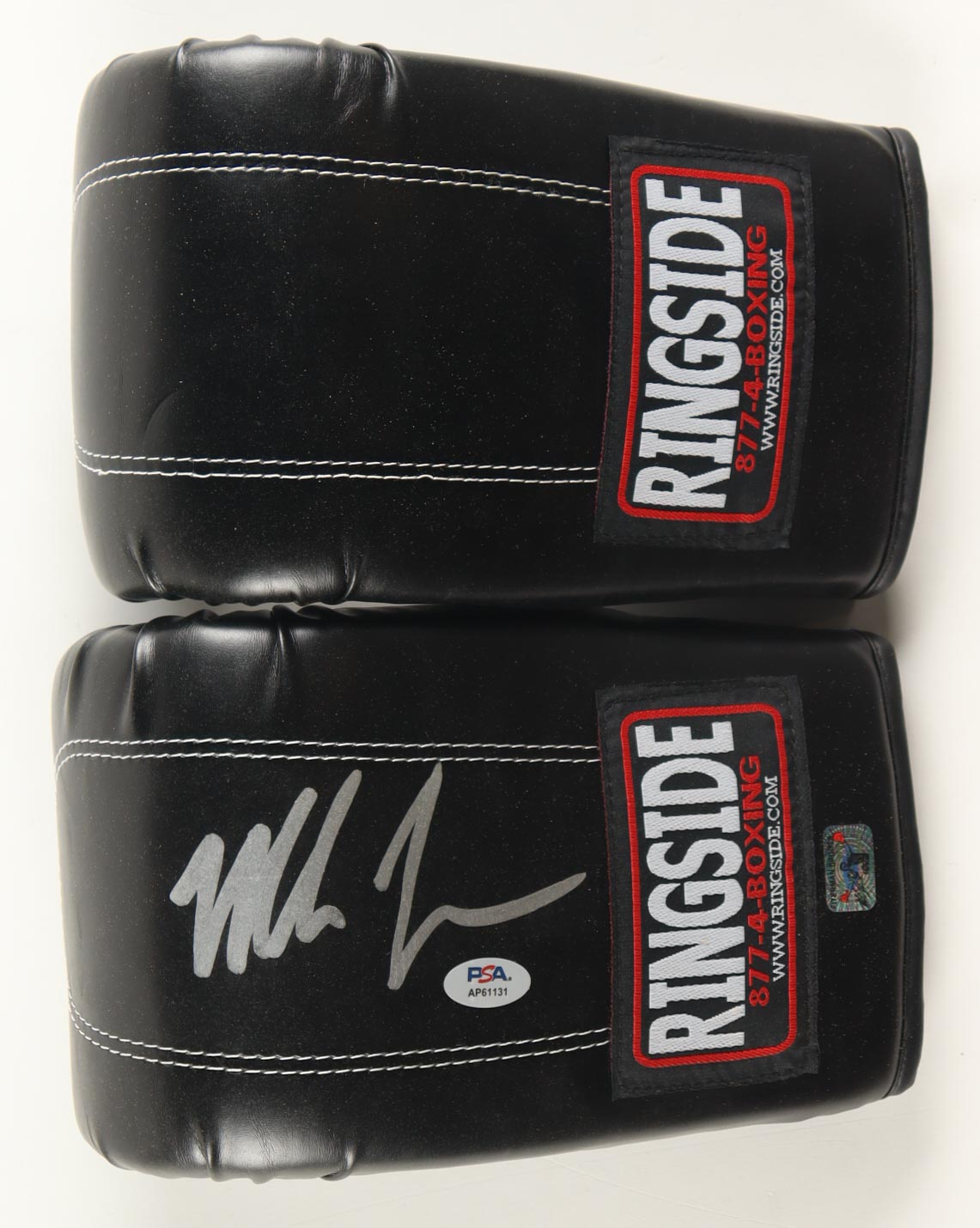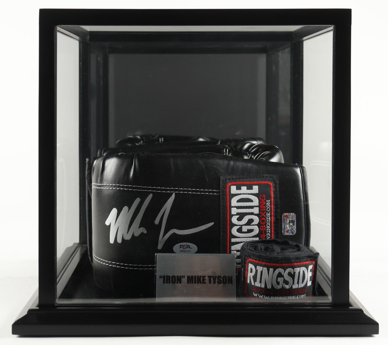 Pair of Ringside boxing gloves. The left-handed glove has been hand-signed by Mike Tyson (HOF). Includes display case and wrist wraps as shown.