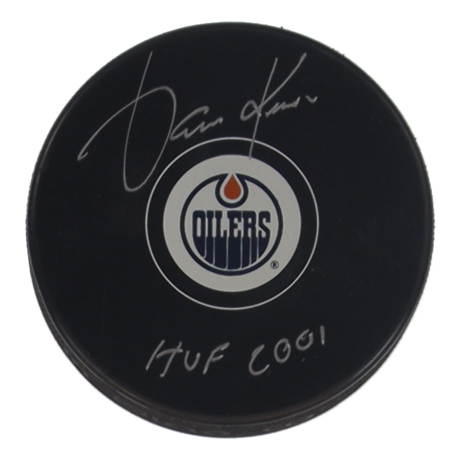 Edmonton Oilers Logo Hockey Puck. Hand-signed and inscribed by Jari Kurri (HOF).