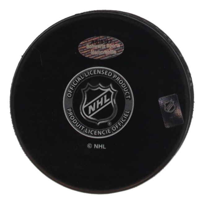 Chicago Blackhawks Logo Hockey Puck. Hand-signed and inscribed by Chris Chelios (HOF).