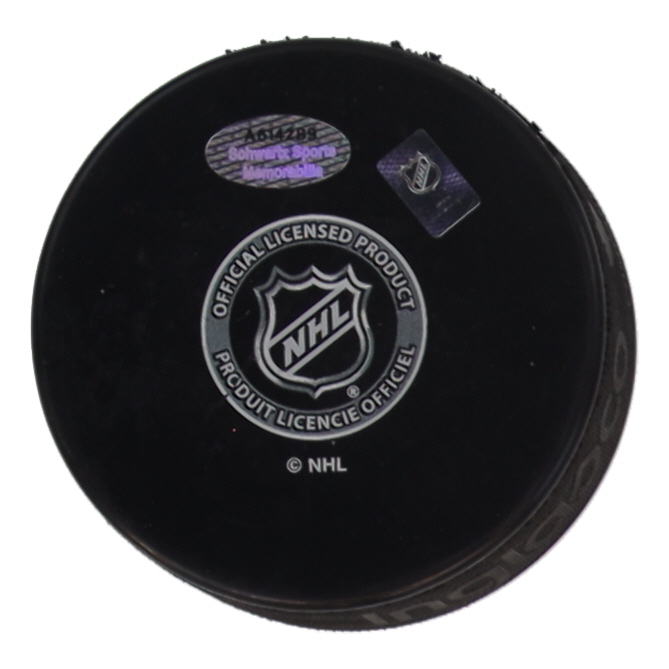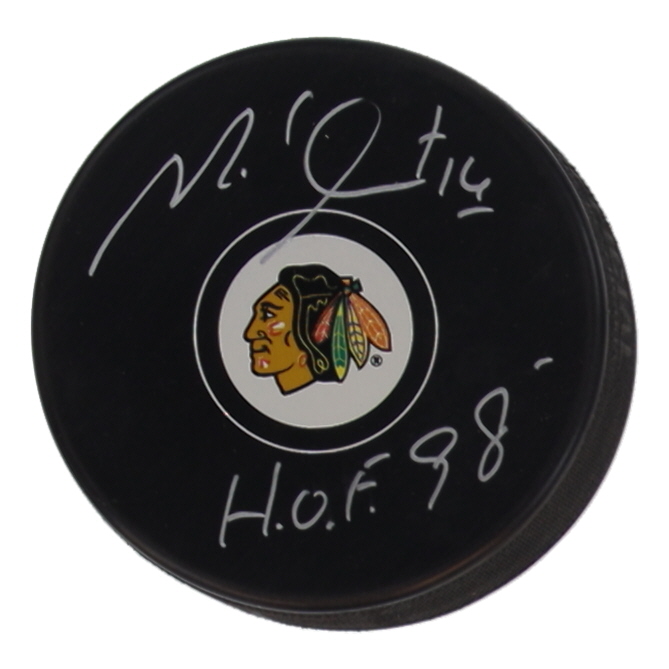 Chicago Blackhawks Logo Hockey Puck. Hand-signed and inscribed by Michel Goulet (HOF).