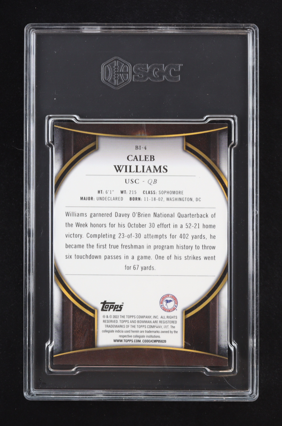 Caleb Williams 2022 Bowman Chrome University Bowman Invicta #BI4 RC (SGC 10)