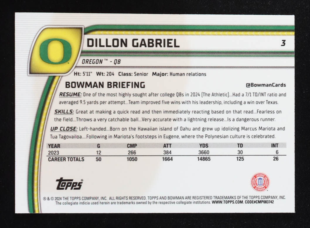Dillon Gabriel 2024 Bowman Chrome Sapphire University #3 RC