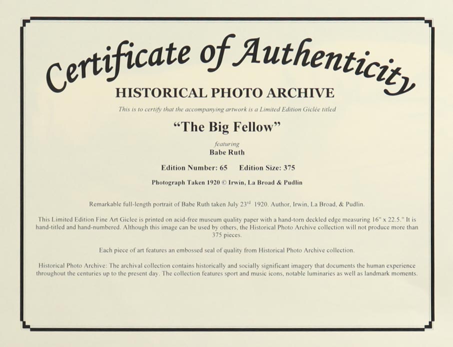 Historical Photo Archive - Babe Ruth "The Big Fellow" Limited Edition 16.5x22 Fine Art Giclee on Paper # 65 /375