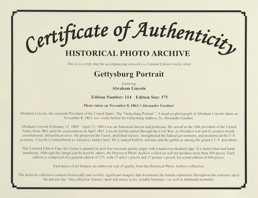 Historical Photo Archive - Abraham Lincoln "Gettysburg Portrait" Limited Edition 16x22.5 Fine Art Giclee on Paper # 114 /375