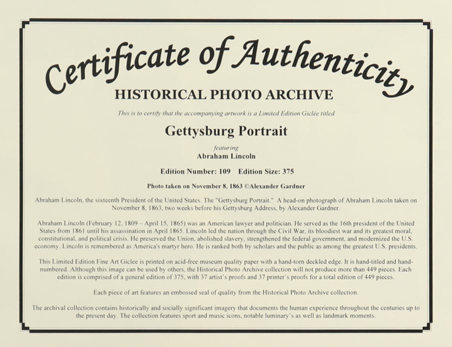 Historical Photo Archive - Abraham Lincoln "Gettysburg Portrait" Limited Edition 16x22.5 Fine Art Giclee on Paper # 109 /375