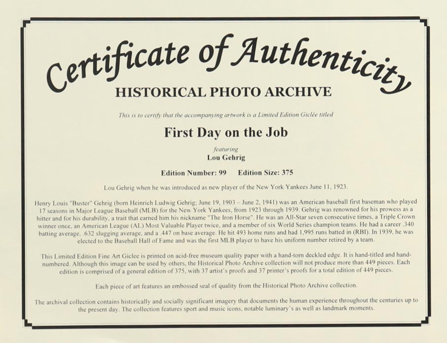 Historical Photo Archive - Lou Gehrig "First Day on the Job" 1923 Limited Edition 16x22.5 Fine Art Giclee on Paper # 99 /375
