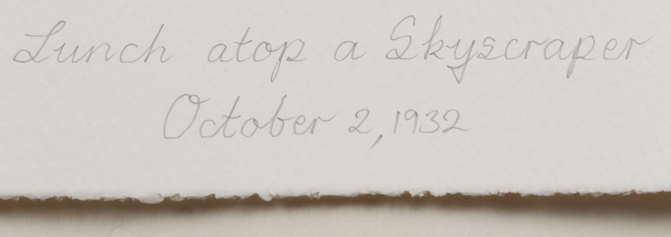 Depicts: Eleven ironworkers casually eating lunch, chatting, and smoking — sitting on a steel beam, 840 feet above the streets of Manhattan with no safety gear.