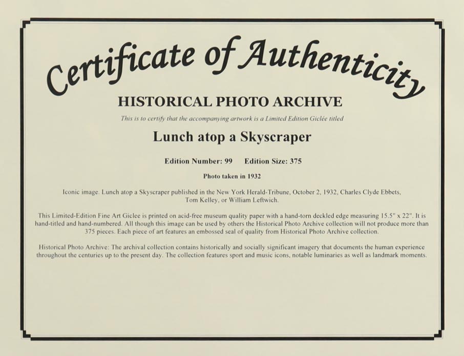 Historical Photo Archive - "Lunch atop a Skyscraper" 1932 Limited Edition 16x22.5 Fine Art Giclee on Paper # 99 /375