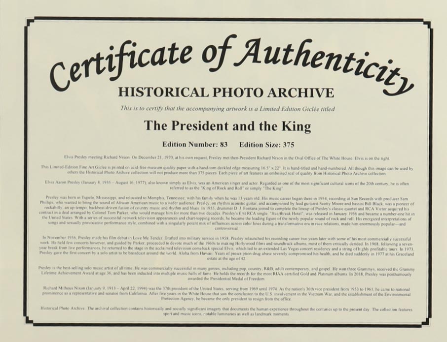 Historical Photo Archive - "The President and the King" 1970 Limited Edition 16x22.5 Fine Art Giclee on Paper # 83 /375