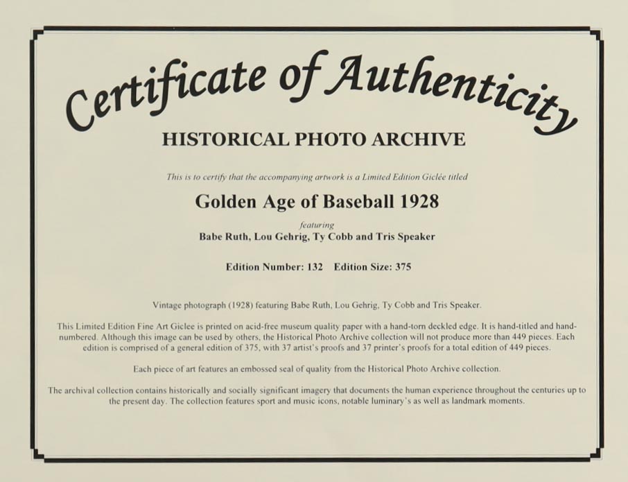 A collectors dream. Giclee photo includes: Babe Ruth, Lou Gehrig, Ty Cobb and Tris Speaker.