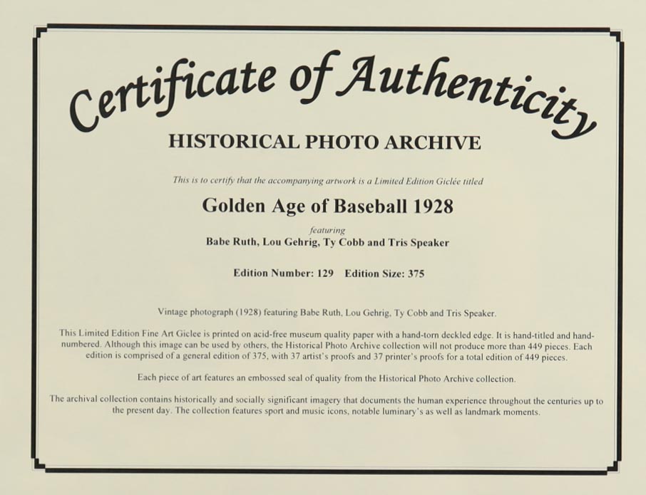 A collectors dream. Giclee photo includes: Babe Ruth, Lou Gehrig, Ty Cobb and Tris Speaker.