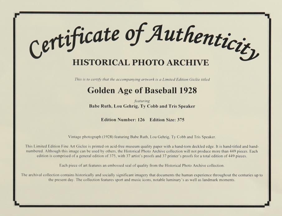 A collectors dream. Giclee photo includes: Babe Ruth, Lou Gehrig, Ty Cobb and Tris Speaker.