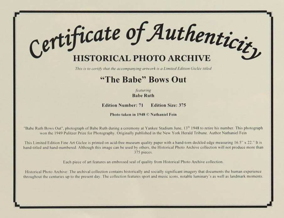 Historical Photo Archive - Babe Ruth ""The Babe" Bows Out" 1948 Limited Edition 16x22.5 Fine Art Giclee on Paper # 71 /375
