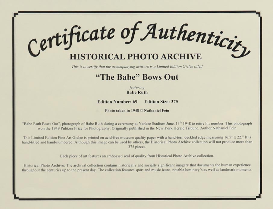 Historical Photo Archive - Babe Ruth ""The Babe" Bows Out" 1948 Limited Edition 16x22.5 Fine Art Giclee on Paper # 69 /375