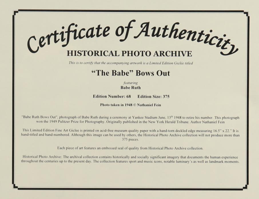 Historical Photo Archive - Babe Ruth ""The Babe" Bows Out" 1948 Limited Edition 16x22.5 Fine Art Giclee on Paper # 68 /375