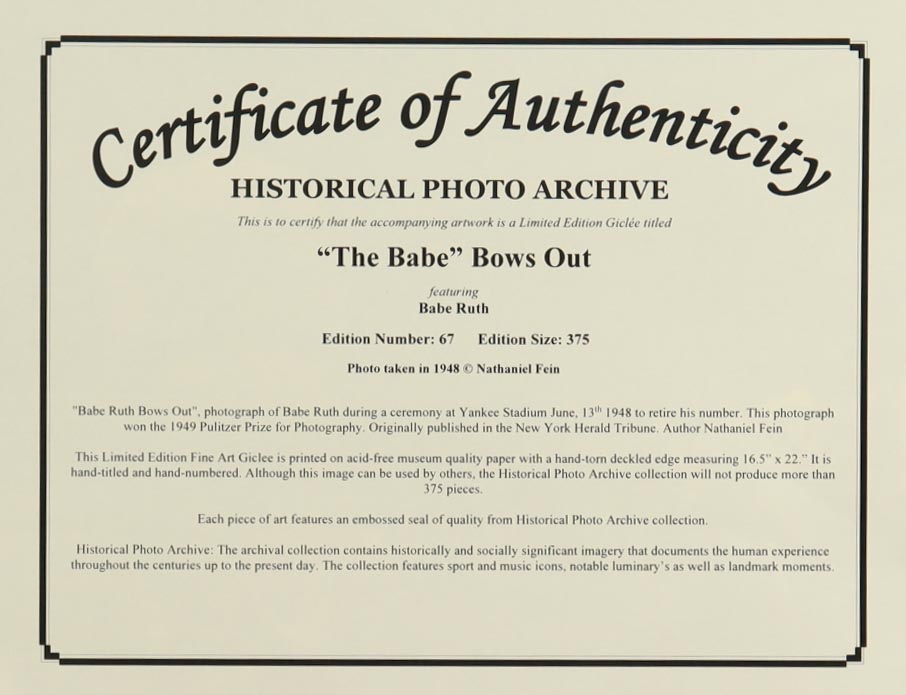 Historical Photo Archive - Babe Ruth ""The Babe" Bows Out" 1948 Limited Edition 16x22.5 Fine Art Giclee on Paper # 67 /375