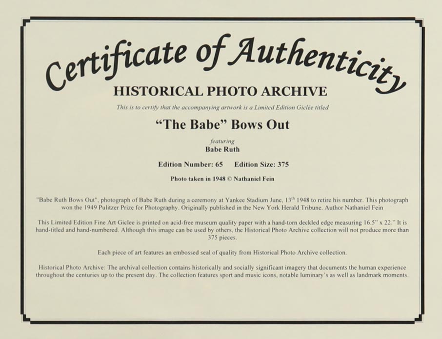 Historical Photo Archive - Babe Ruth ""The Babe" Bows Out" 1948 Limited Edition 16x22.5 Fine Art Giclee on Paper # 65 /375