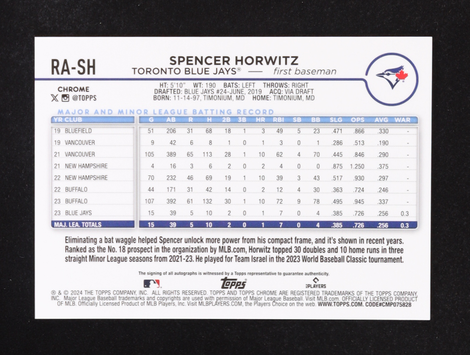 Spencer Horwitz 2024 Topps Chrome Rookie Autographs #RASH RC