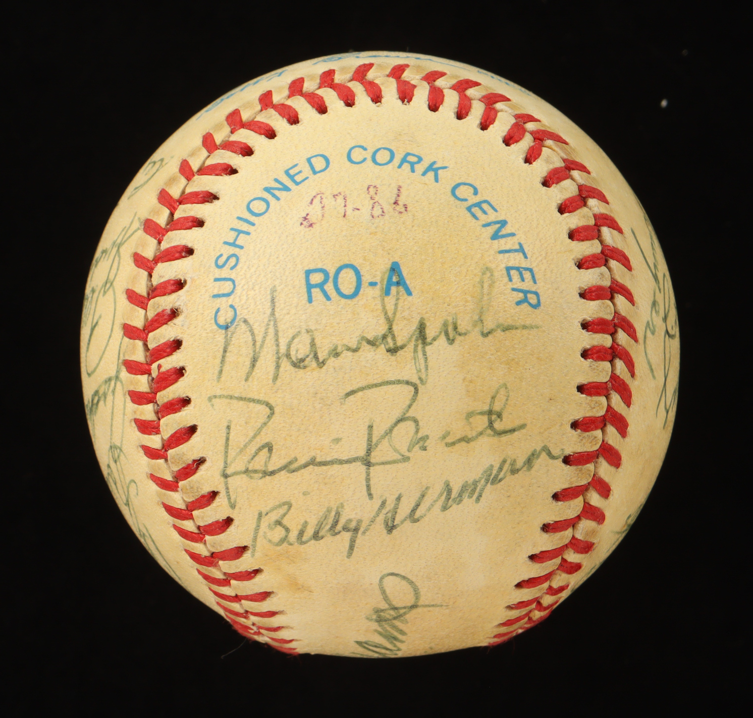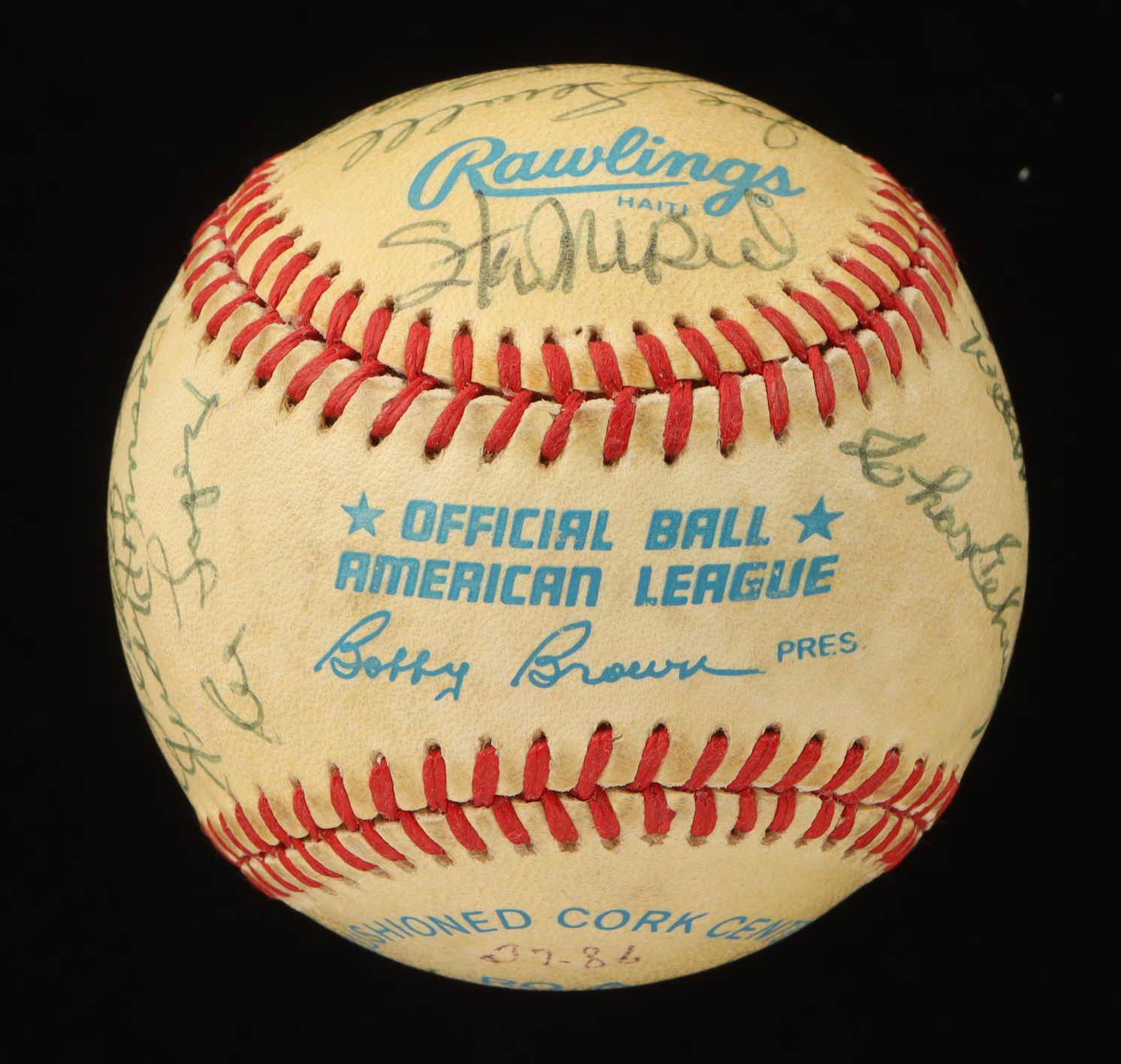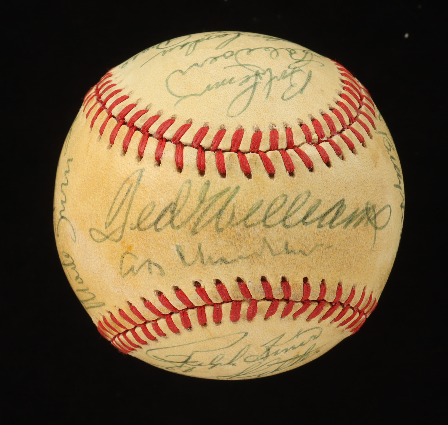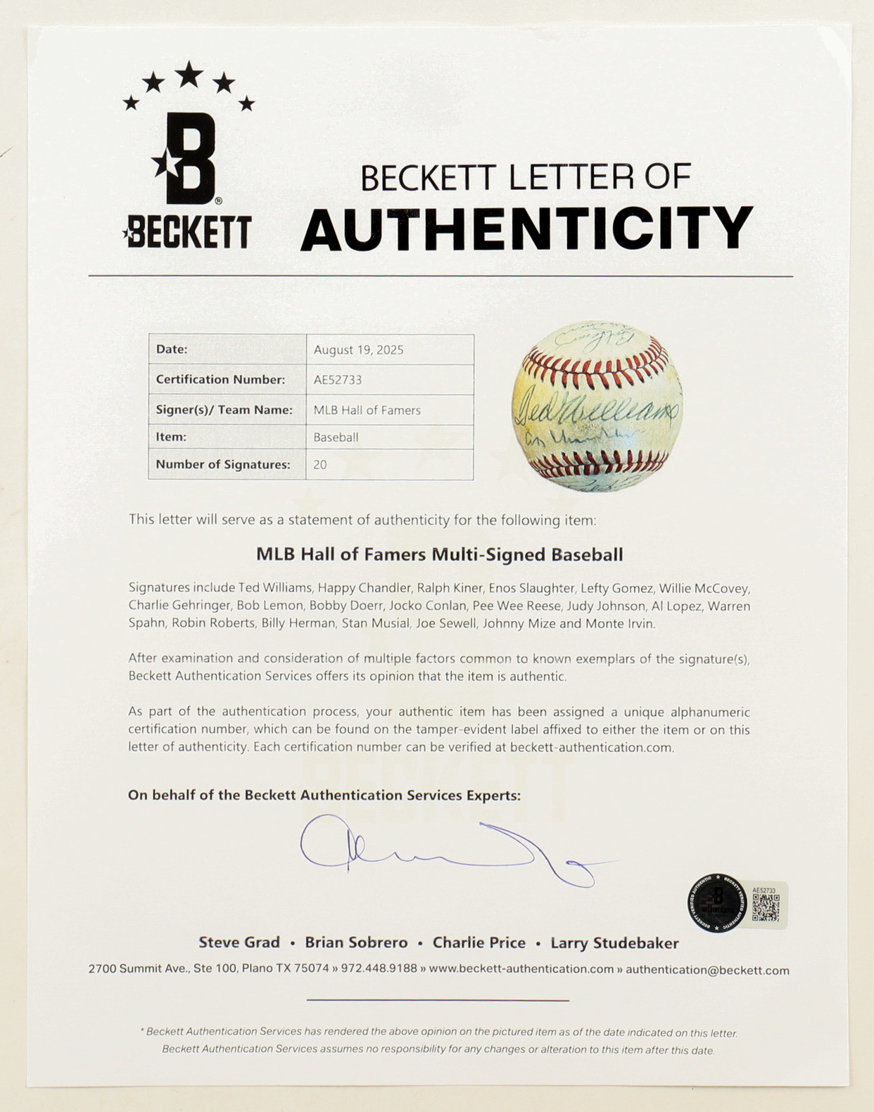 Rawlings Official American League baseball has been hand-signed by (20) including Ted Williams, Happy Chandler, Ralph Kiner, Enos Slaughter, Lefty Gomez, Willie McCovey, Charlie Gehringer, Bob Lemon, Bobby Doerr, Jocko Conlan, Pee Wee Reese, Judy Johnson, Al Lopez, Warren Spahn, Robin Roberts, Billy Herman, Stan Musial, Joe Sewell, Johnny Mize and Monte Irvin.
