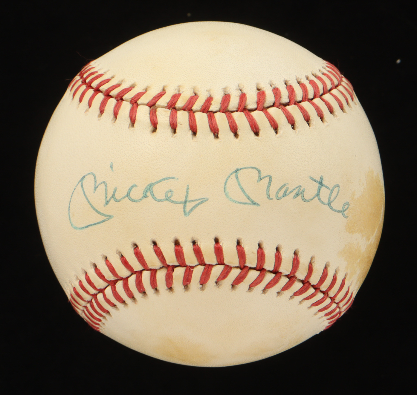 Rawlings Official American League baseball has been hand-signed by Mickey Mantle (New York Yankees). Please note, baseball has been naturally toned and stained throughout and the signature is fading.