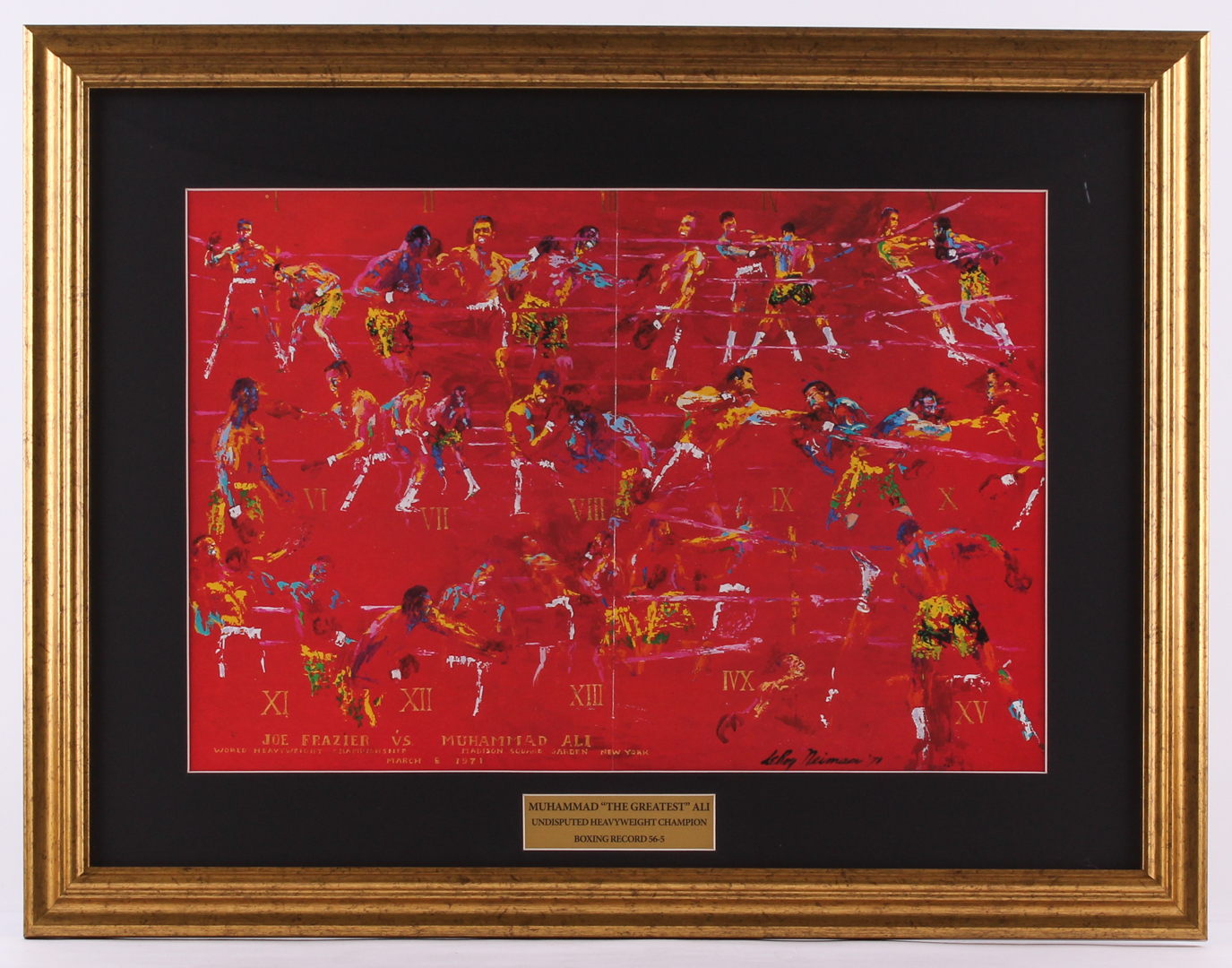 Custom frame measures approximately 19.75" x 25.75" in size and features a print of Muhammad Ali (D. 2016) in the ring versus Joe Frazier (D. 2011) from artist LeRoy Neiman (D. 2012). Please note, the display is made up of separate prints and the signature is a facsimile.