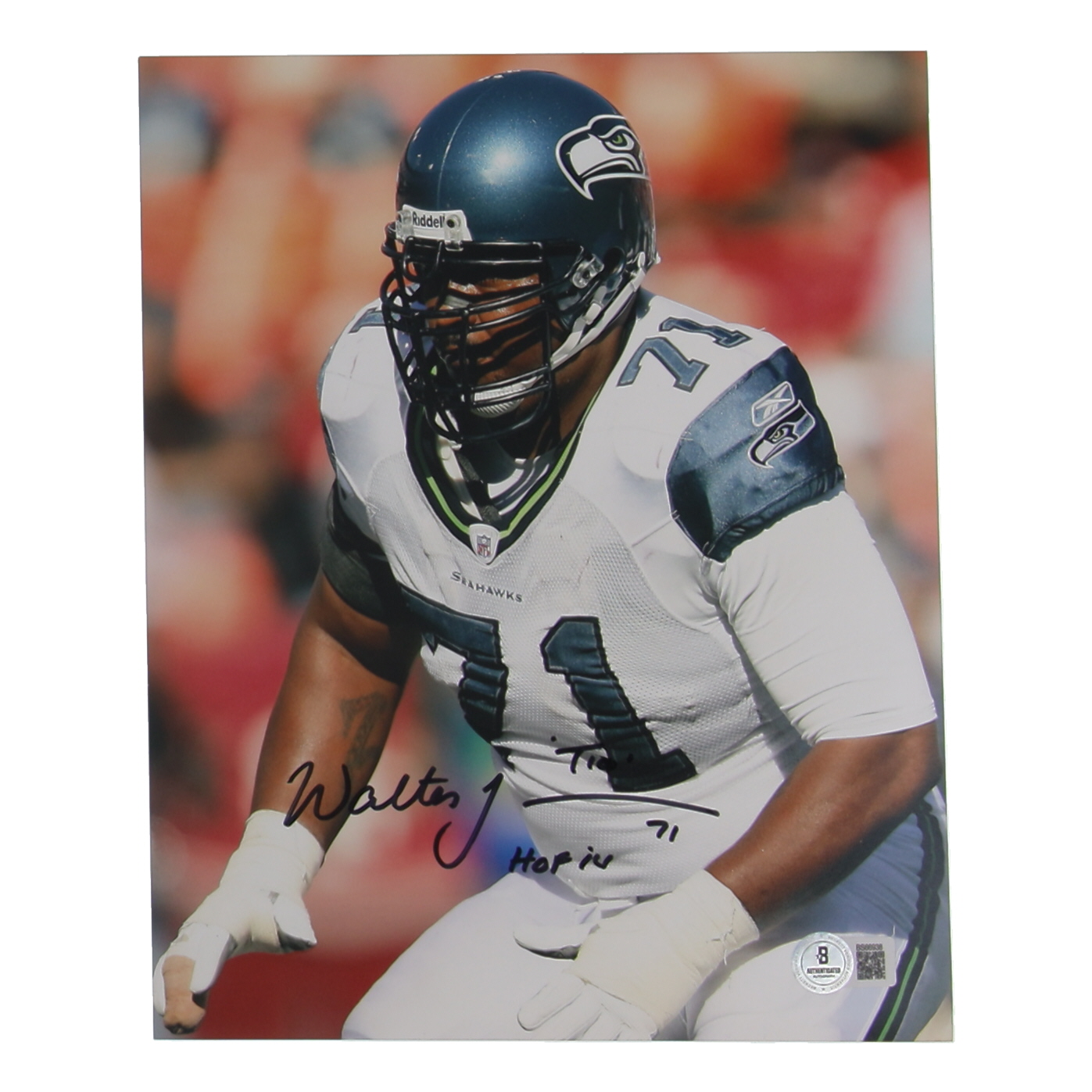 Photo measures 8" x 10" in size. Hand-signed and inscribed by Walter Jones (Seattle Seahawks, HOF)