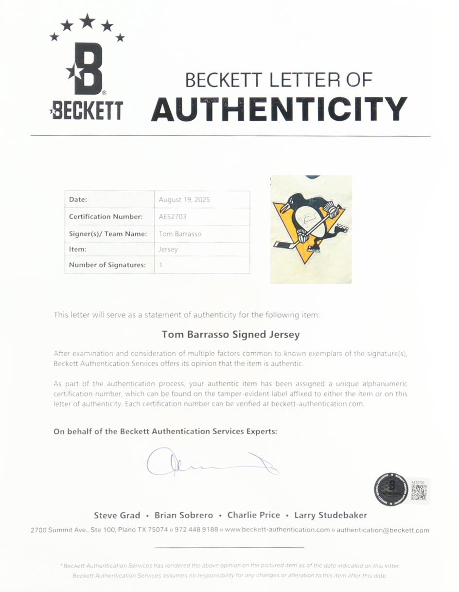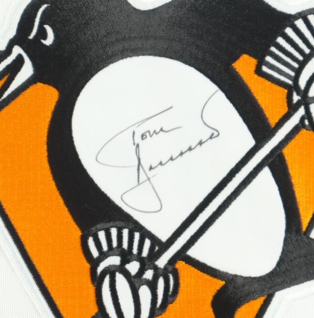 Custom frame measures approximately 33" x 35" in size and features an authentic CCM Pittsburgh Penguins jersey size 56, that has been hand-signed by Tom Barrasso (Pittsburgh Penguins, HOF).