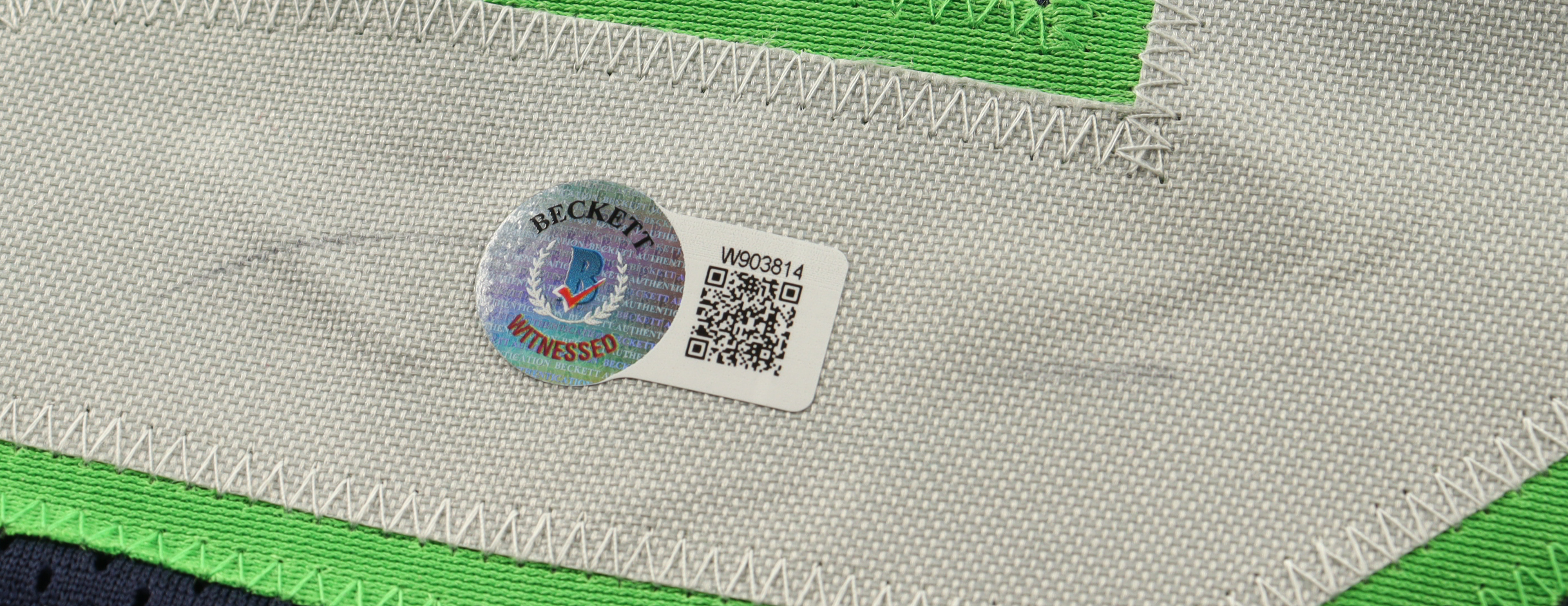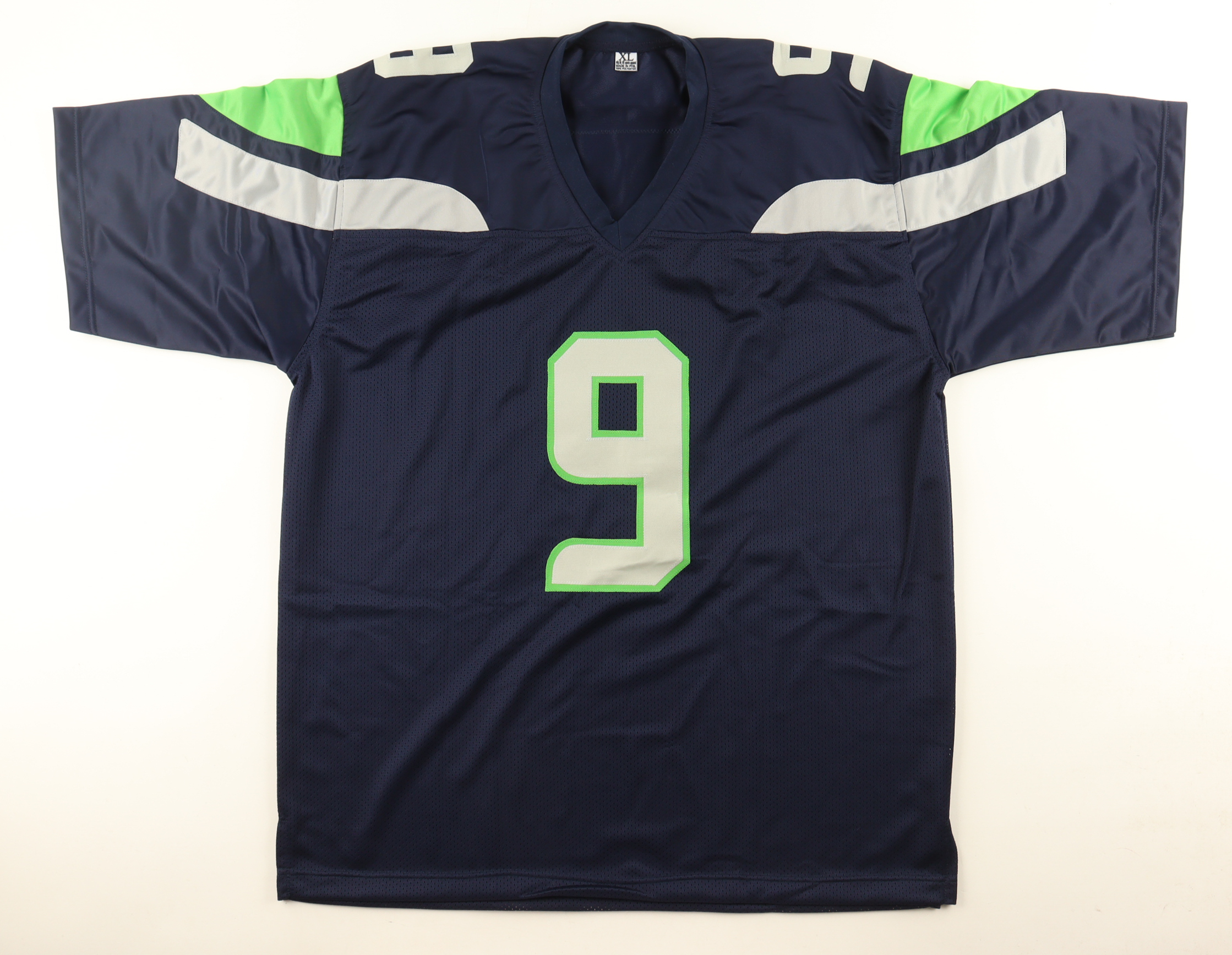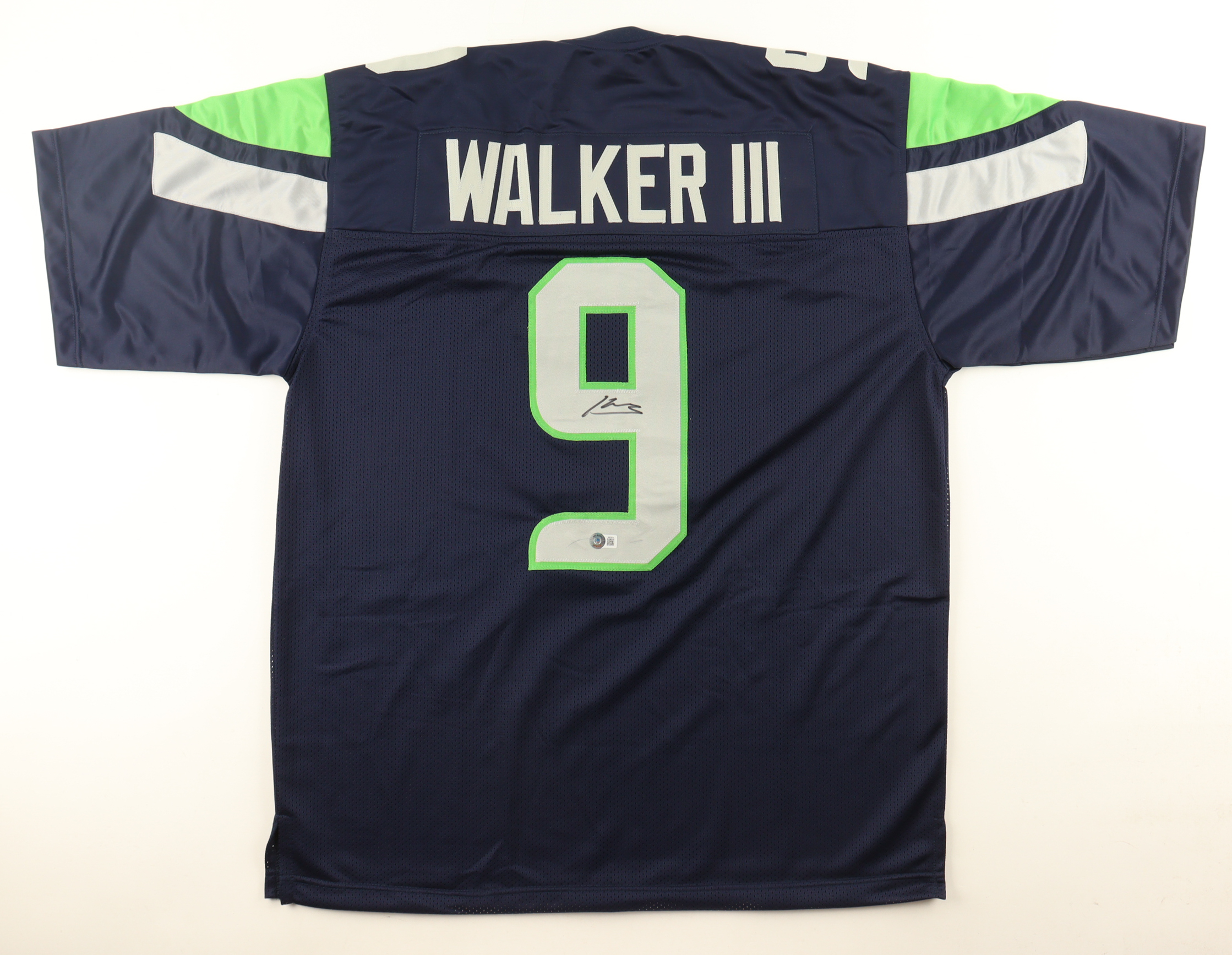 Custom jersey with everything sewn on, size XL. Hand-signed by Kenneth Walker III (Seattle Seahawks). Please note, the reverse number is stained.