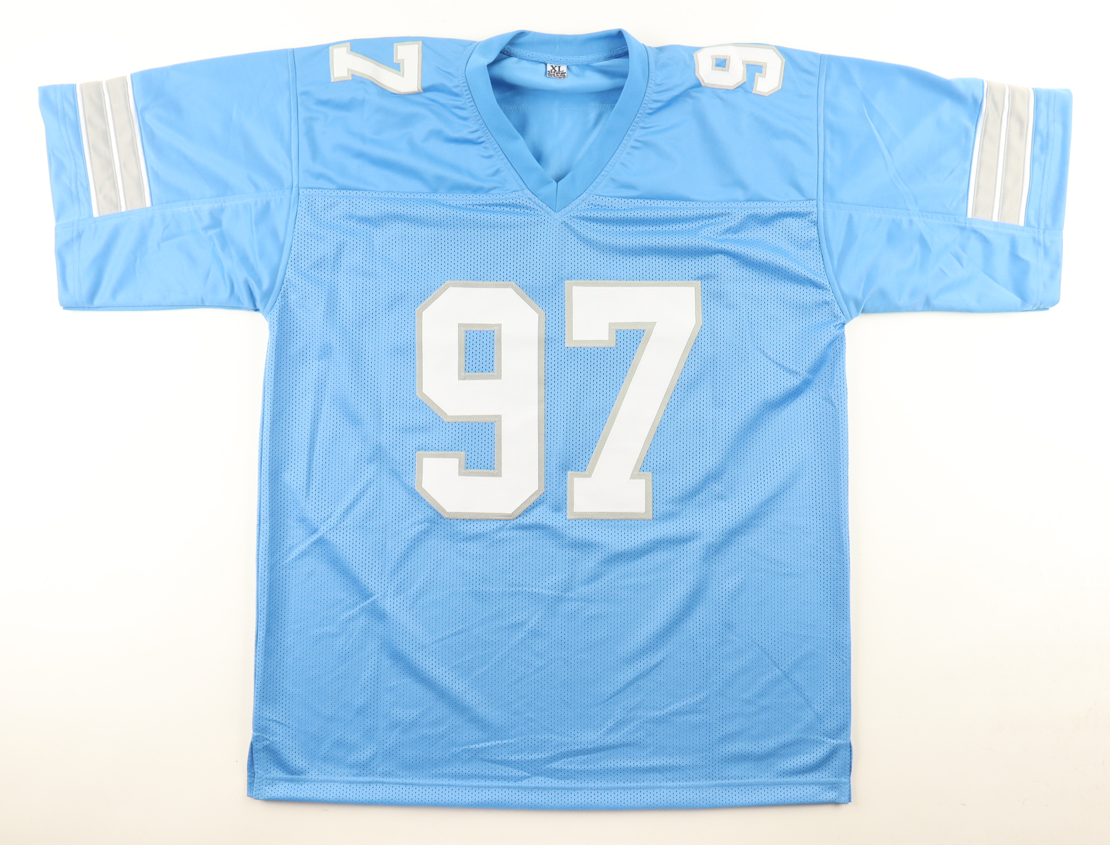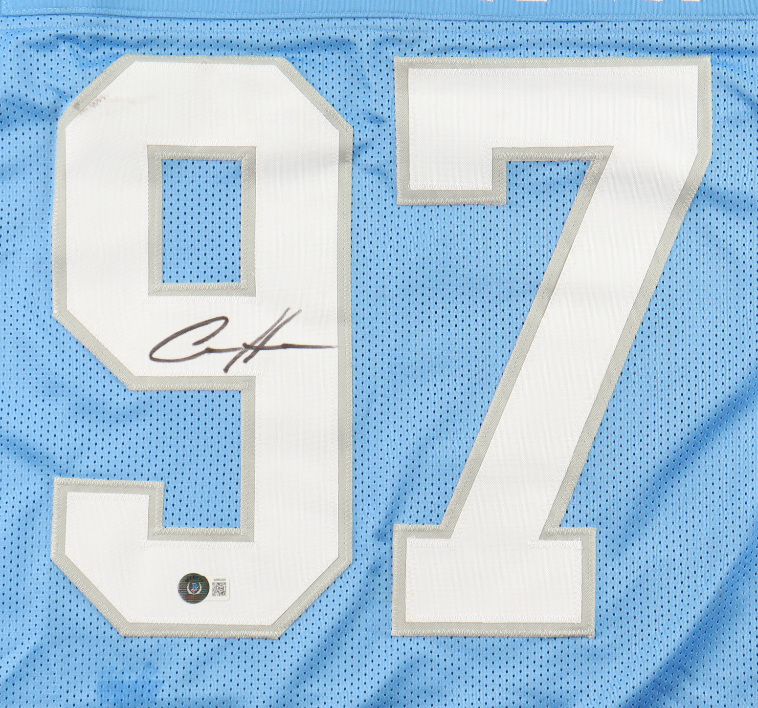 Custom jersey with everything sewn on, size XL. Hand-signed by Aidan Hutchinson (Detroit Lions). Please note, the reverse number is lightly stained.
