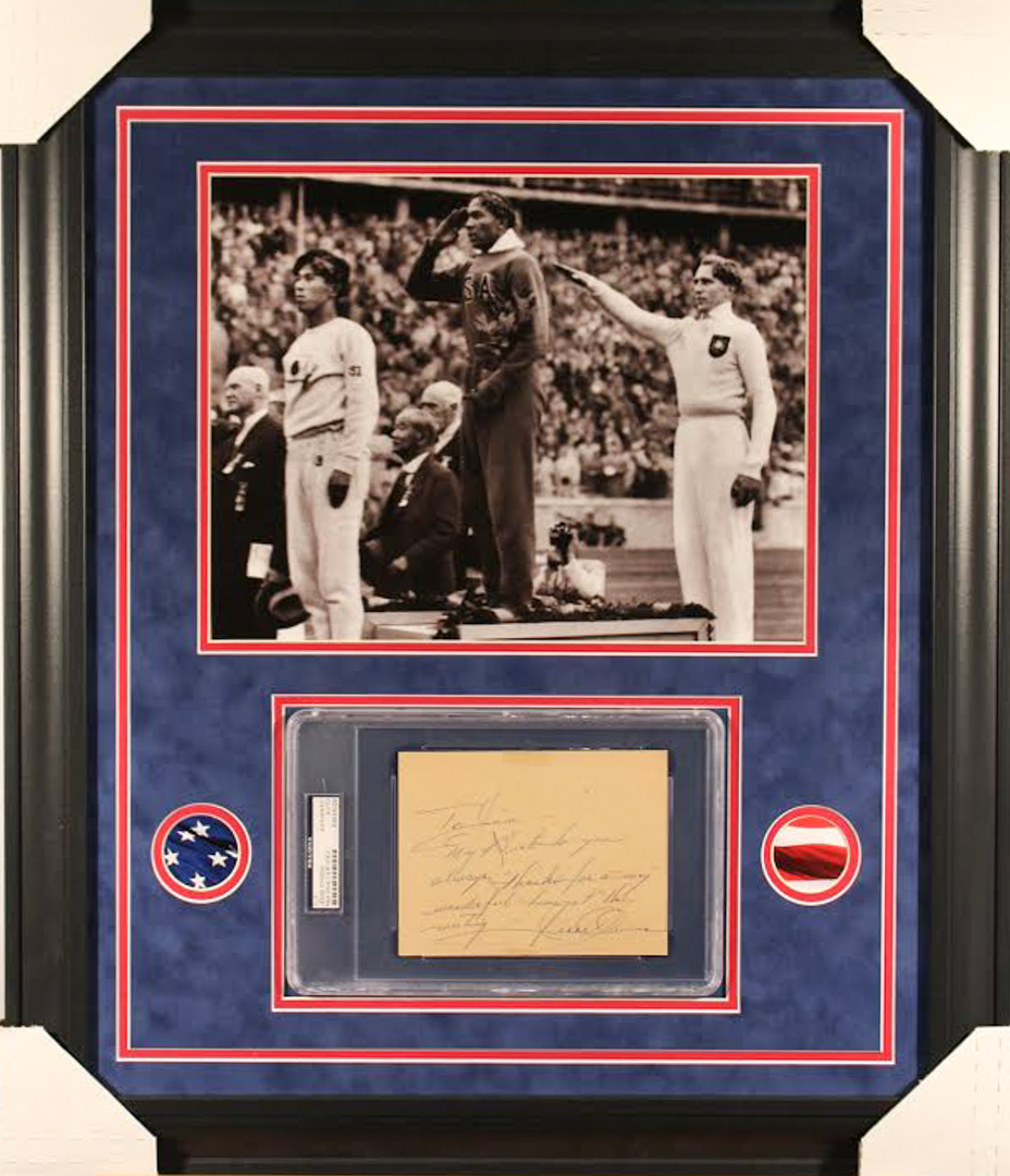 Jesse Owens Signed 1936 Olympic 23x27 Custom Framed Cut Display with Inscription (PSA Encapsulated)