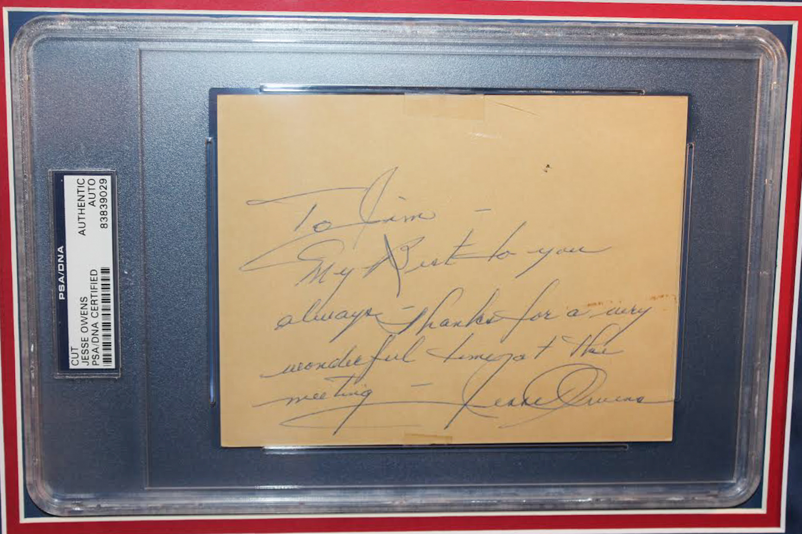 Custom framed display measures 23" x 27" in size and has been hand-signed and inscribed in blue ink pen by Jesse Owens (D. 1980). Please note the autograph is personalized to Jim.