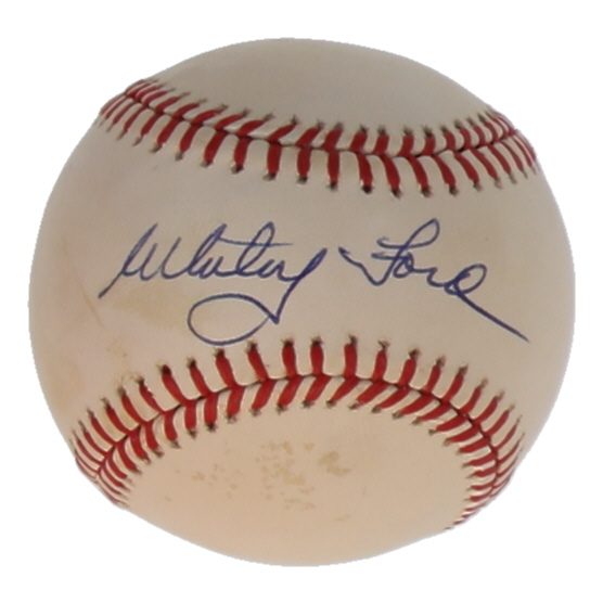 Rawlings Official American League Baseball. Hand-signed by Whitey Ford (D. 2020, New York Yankees, HOF). Please note, the baseball is naturally toned and stained.