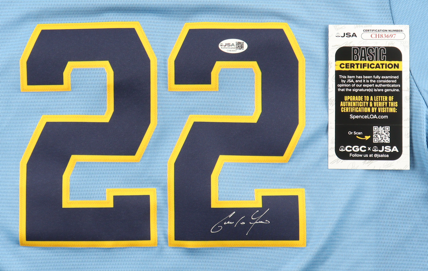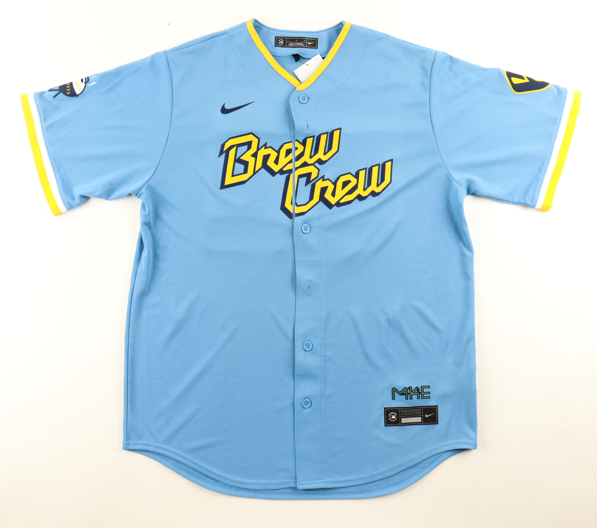 Nike jersey with everything pressed on, size L. Hand-signed by Christian Yelich (Milwaukee Brewers).