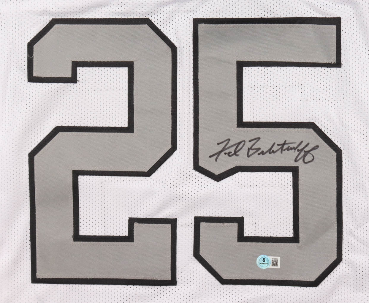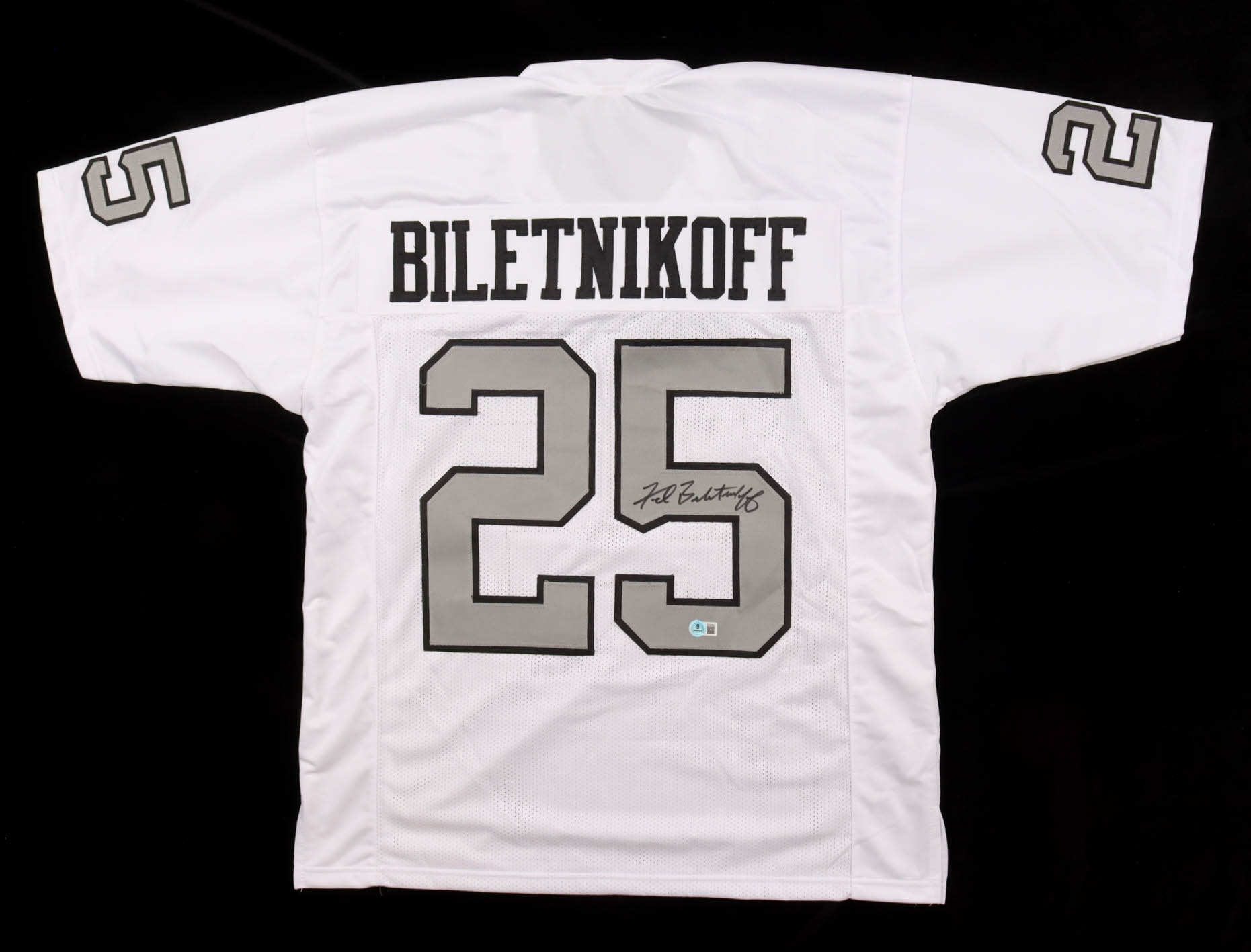 Custom jersey with everything sewn on, size XL. Hand-signed by Fred Biletnikoff (HOF).